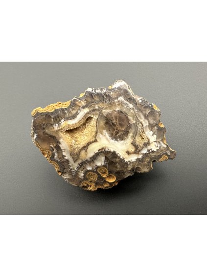 Agates from the Giant Mountains are usually associated with andesite or basalt from the Carboniferous period. Another name is melaphyre or mandelite. This rock is characterised by ‘almond-shaped’ or gas-filled cavities filled with a gelatinous quartz solution. This process took place after the rock had solidified. The parts accessible to surface water, which contained volcanic glass, dissolved and became enriched with silica, which gradually penetrated into small crevices in the rock at depth. Their gradual precipitation created agates of various sizes. There are also so-called Hausachate, which are pseudomorphoses of quartz after barite, and mossachates (chalcedony and agate with chlorite dendrites).