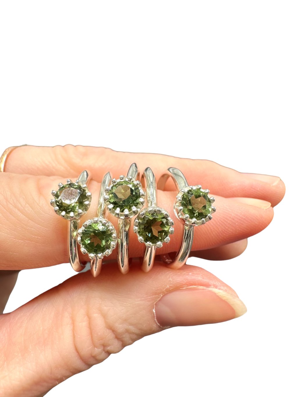 5 Stück Silberringe, verschiedene Größe, mit geschliffenen Moldaviten