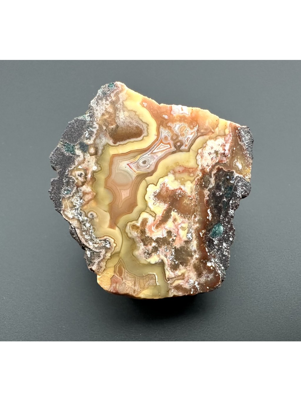 Marokkanische Achate zeichnen sich durch ein bemerkenswertes Farbspektrum aus, in dem oft warme Töne von tiefem Rot über Braun bis Orange dominieren. Zwischen den Schichten können dünne weißliche oder graue Linien auftreten, die elegante Streifen und manchmal so genannte ockerfarbene“ Strukturen bilden. Einige Stücke haben winzige Hohlräume, die mit Quarz- oder Amethystkristallen gefüllt sind, was die Attraktivität des Steins beim Schleifen und Polieren erhöht.