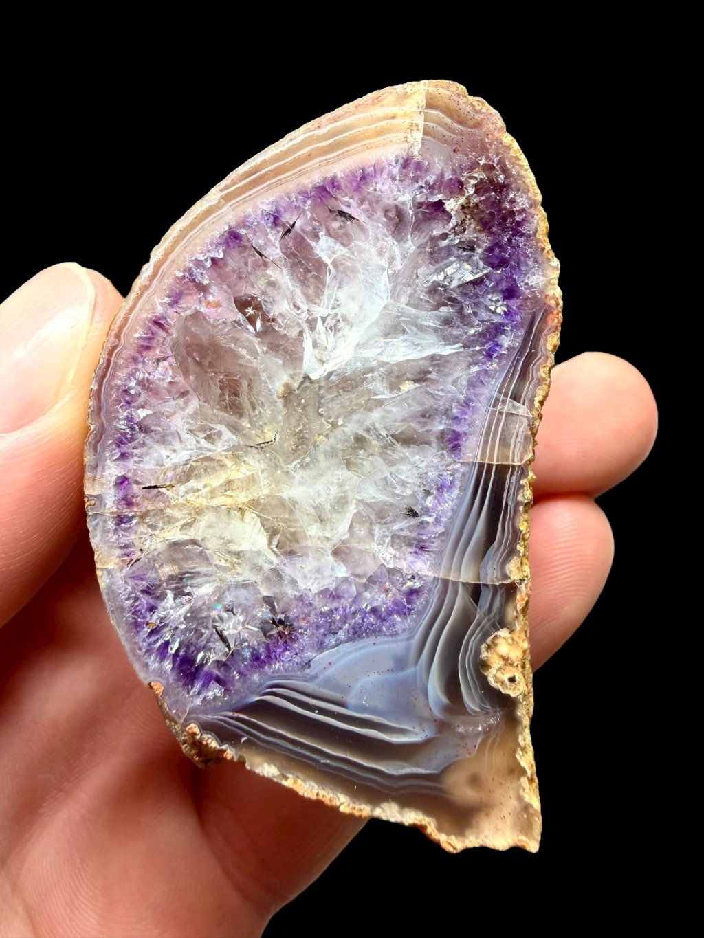 Diese farbigen Quarzvarietäten wechseln sich häufig ab und bilden geschichtete Zonen (weißlicher Quarz, Amethyst oder Amethyst, der in Rauchquarz übergeht usw.). An kleineren Stücken tritt die dichtere, manchmal angenehm pastellfarbene Achatzeichnung stärker hervor.