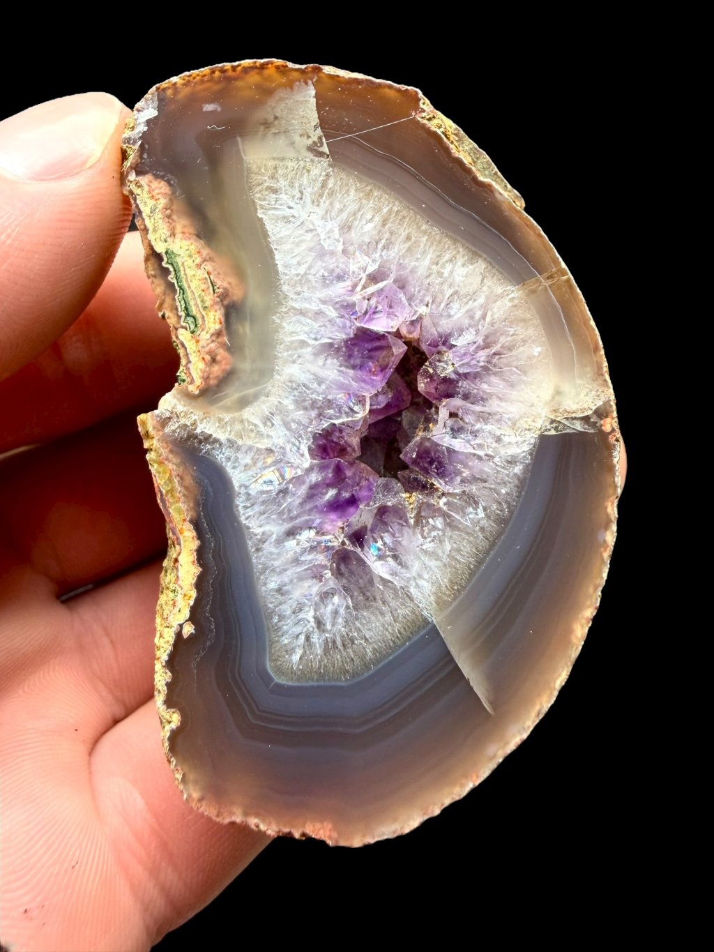 Diese farbigen Quarzvarietäten wechseln sich häufig ab und bilden geschichtete Zonen (weißlicher Quarz, Amethyst oder Amethyst, der in Rauchquarz übergeht usw.). An kleineren Stücken tritt die dichtere, manchmal angenehm pastellfarbene Achatzeichnung stärker hervor.