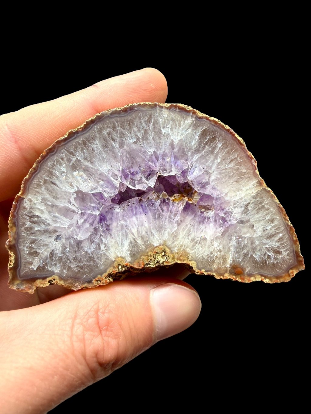 Diese farbigen Quarzvarietäten wechseln sich häufig ab und bilden geschichtete Zonen (weißlicher Quarz, Amethyst oder Amethyst, der in Rauchquarz übergeht usw.). An kleineren Stücken tritt die dichtere, manchmal angenehm pastellfarbene Achatzeichnung stärker hervor.