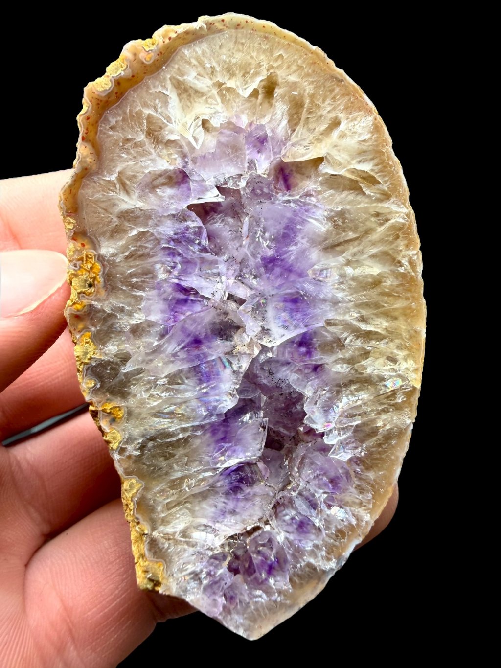 Diese farbigen Quarzvarietäten wechseln sich häufig ab und bilden geschichtete Zonen (weißlicher Quarz, Amethyst oder Amethyst, der in Rauchquarz übergeht usw.). An kleineren Stücken tritt die dichtere, manchmal angenehm pastellfarbene Achatzeichnung stärker hervor.