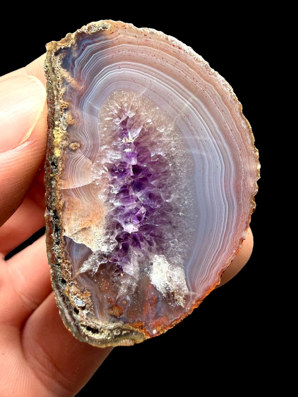 Diese farbigen Quarzvarietäten wechseln sich häufig ab und bilden geschichtete Zonen (weißlicher Quarz, Amethyst oder Amethyst, der in Rauchquarz übergeht usw.). An kleineren Stücken tritt die dichtere, manchmal angenehm pastellfarbene Achatzeichnung stärker hervor.