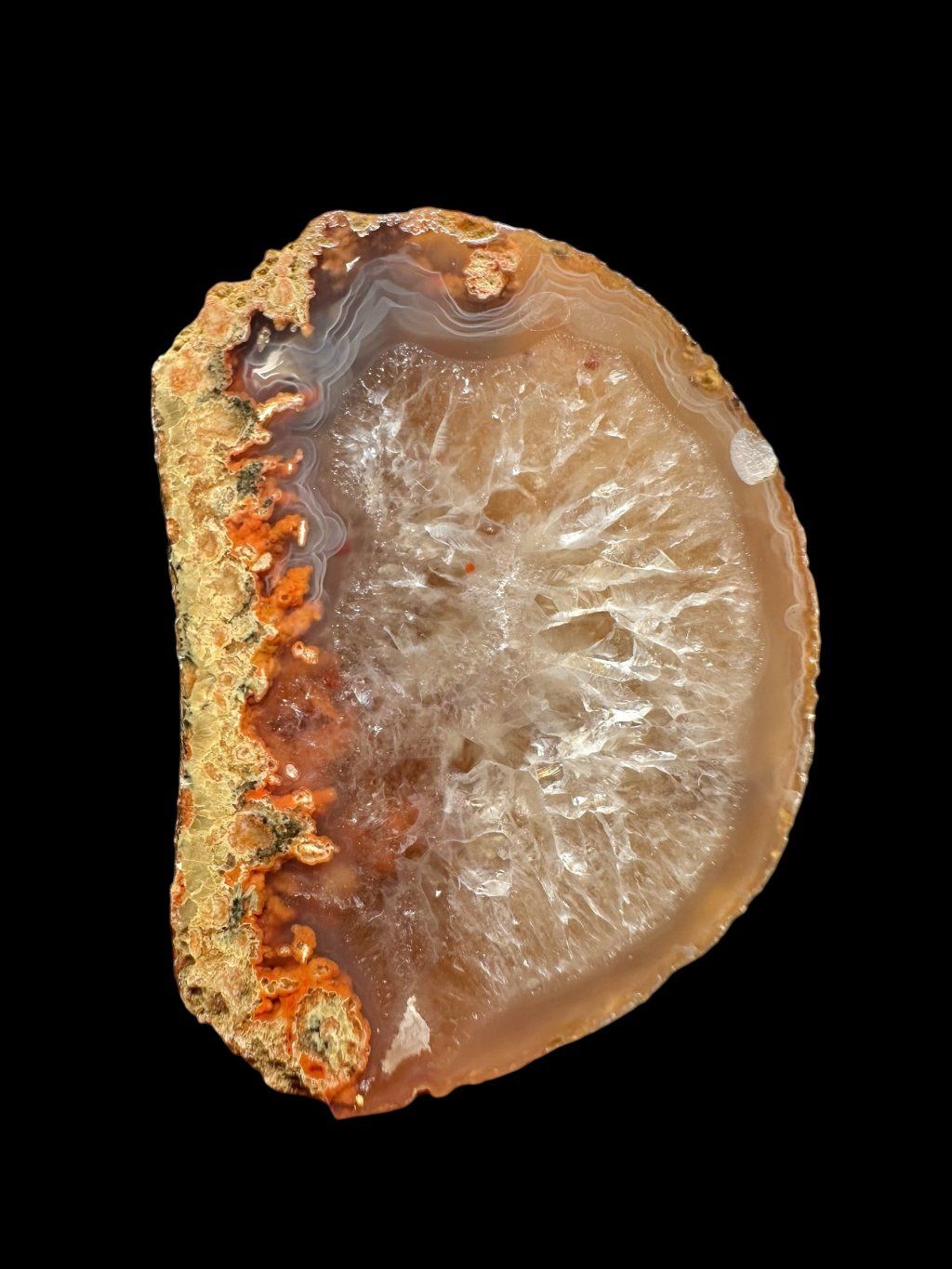 Diese farbigen Quarzvarietäten wechseln sich häufig ab und bilden geschichtete Zonen (weißlicher Quarz, Amethyst oder Amethyst, der in Rauchquarz übergeht usw.). An kleineren Stücken tritt die dichtere, manchmal angenehm pastellfarbene Achatzeichnung stärker hervor.