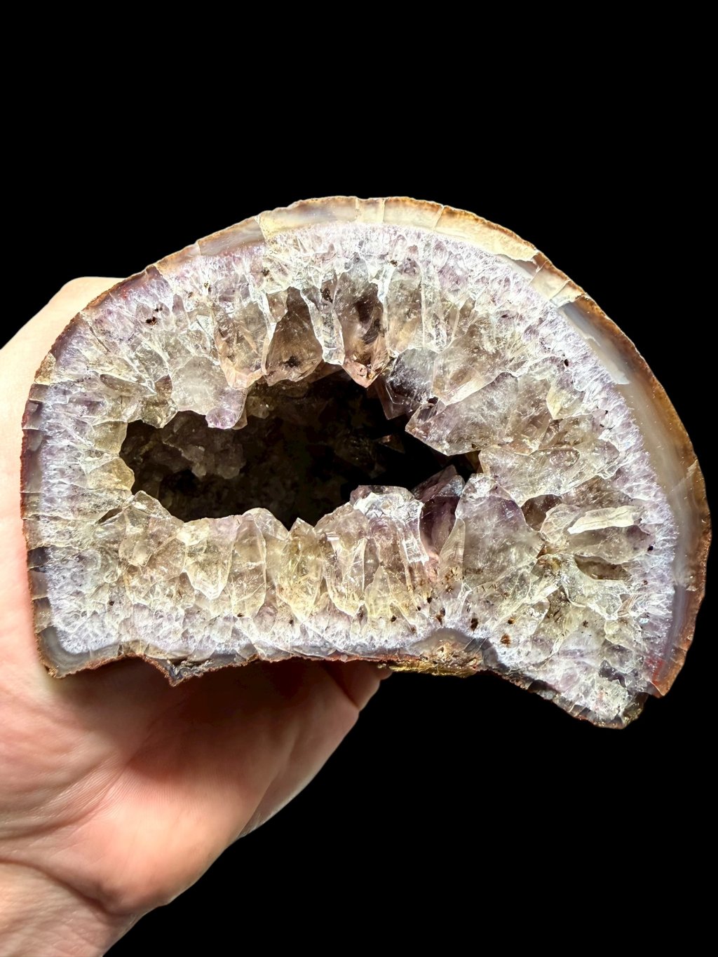 Diese farbigen Quarzvarietäten wechseln sich häufig ab und bilden geschichtete Zonen (weißlicher Quarz, Amethyst oder Amethyst, der in Rauchquarz übergeht usw.). An kleineren Stücken tritt die dichtere, manchmal angenehm pastellfarbene Achatzeichnung stärker hervor.