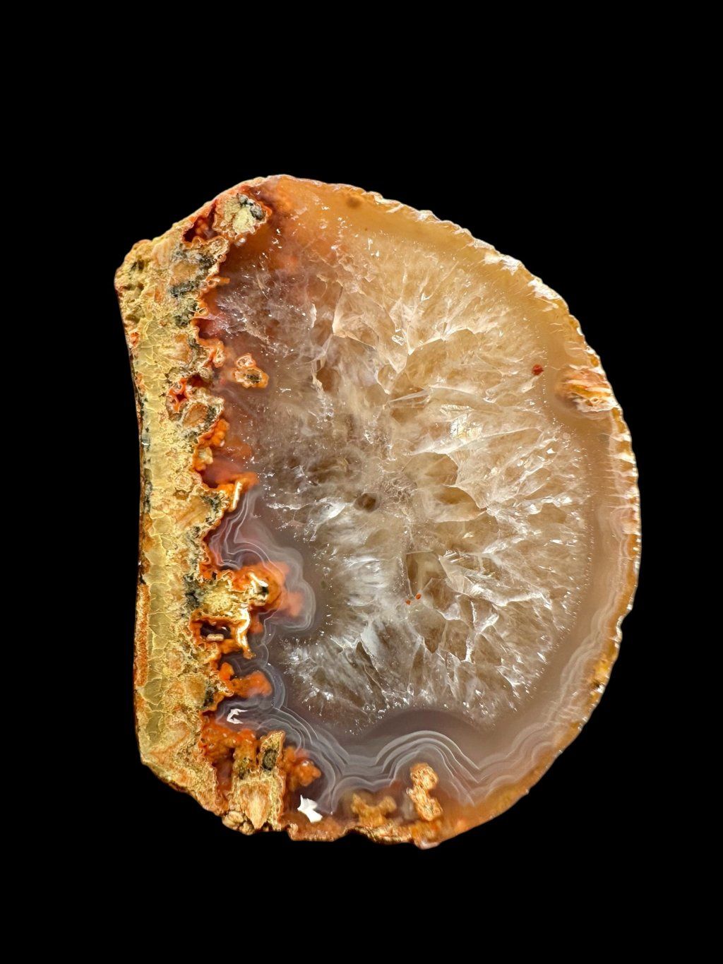 Diese farbigen Quarzvarietäten wechseln sich häufig ab und bilden geschichtete Zonen (weißlicher Quarz, Amethyst oder Amethyst, der in Rauchquarz übergeht usw.). An kleineren Stücken tritt die dichtere, manchmal angenehm pastellfarbene Achatzeichnung stärker hervor.