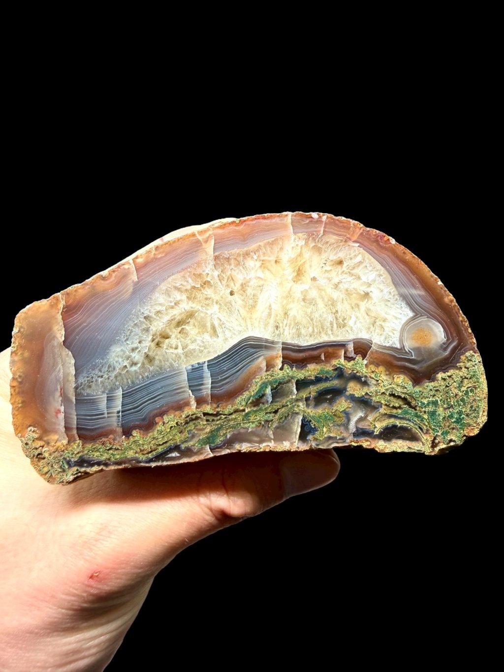 Diese farbigen Quarzvarietäten wechseln sich häufig ab und bilden geschichtete Zonen (weißlicher Quarz, Amethyst oder Amethyst, der in Rauchquarz übergeht usw.). An kleineren Stücken tritt die dichtere, manchmal angenehm pastellfarbene Achatzeichnung stärker hervor.