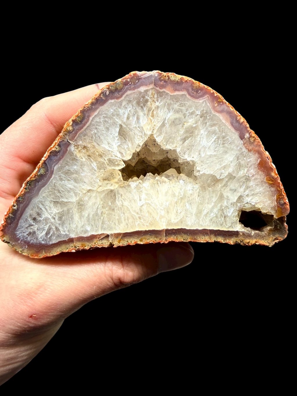 Diese farbigen Quarzvarietäten wechseln sich häufig ab und bilden geschichtete Zonen (weißlicher Quarz, Amethyst oder Amethyst, der in Rauchquarz übergeht usw.). An kleineren Stücken tritt die dichtere, manchmal angenehm pastellfarbene Achatzeichnung stärker hervor.