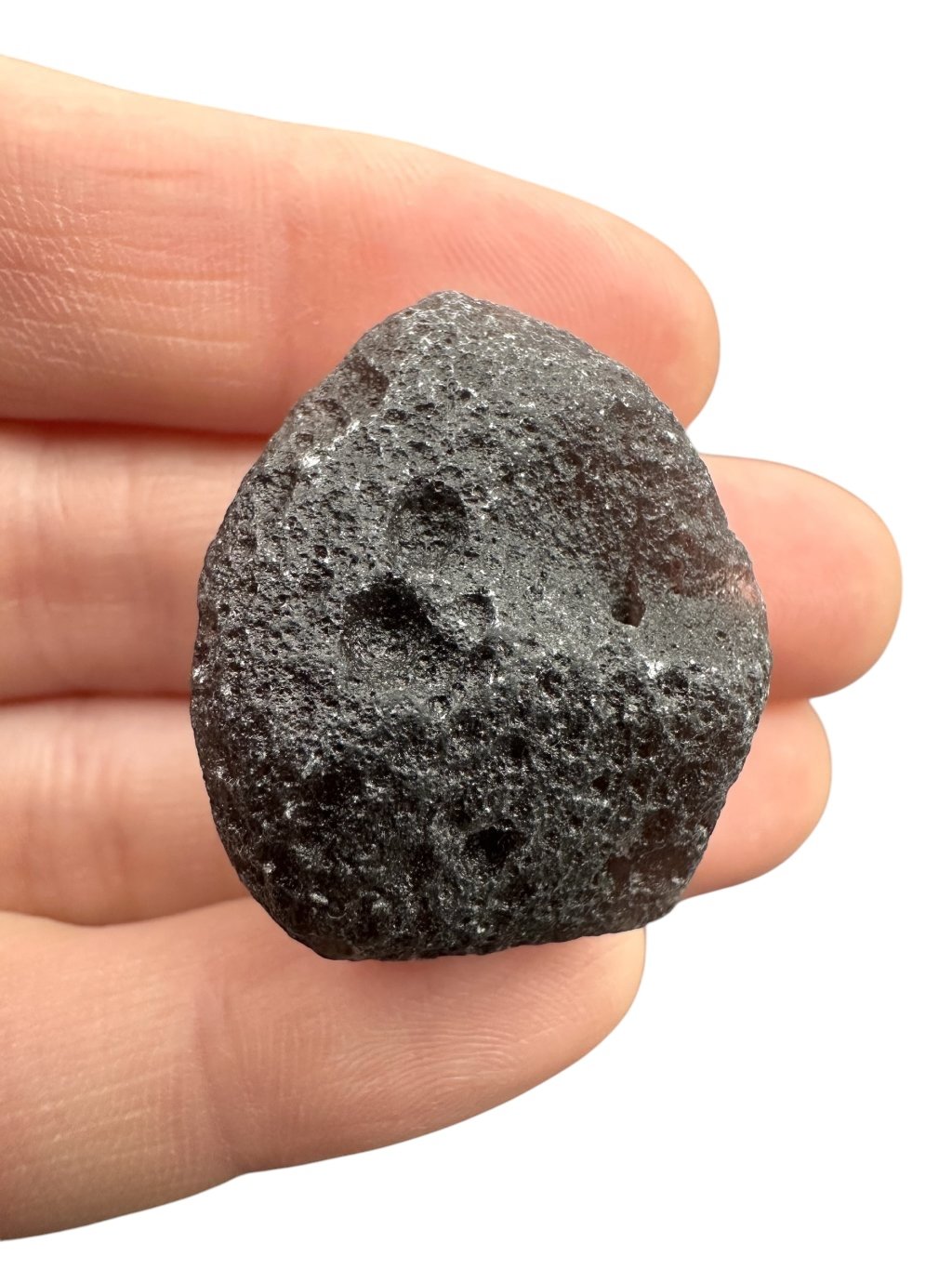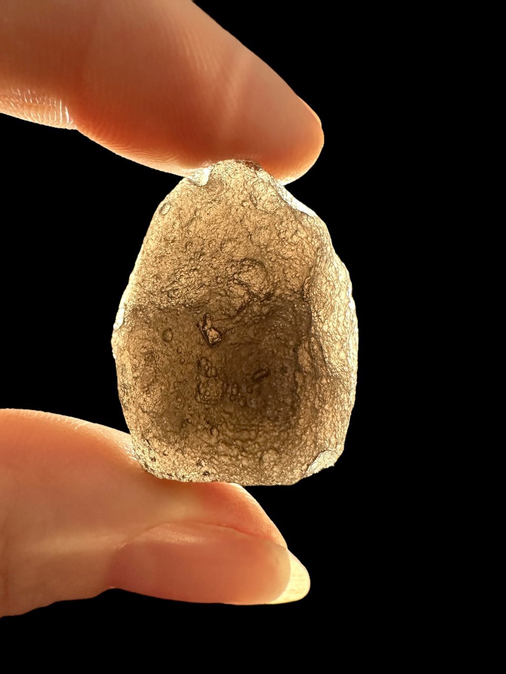 Dieser Stein hat eine dunkle, fast undurchsichtige Farbe, die von grau bis schwarz reicht. Die Oberfläche kann glasig und strukturiert sein, manchmal mit winzigen Bläschen, was typisch für Tektite ist.