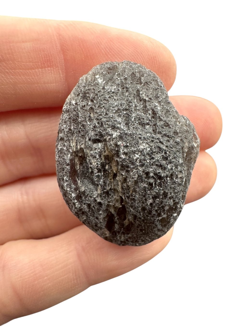 Dieser Stein hat eine dunkle, fast undurchsichtige Farbe, die von grau bis schwarz reicht. Die Oberfläche kann glasig und strukturiert sein, manchmal mit winzigen Bläschen, was typisch für Tektite ist.