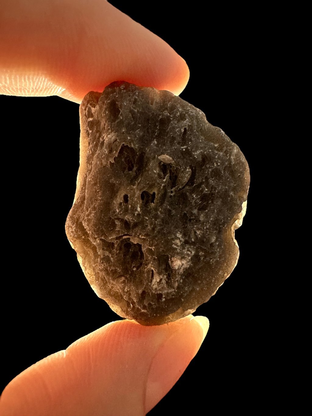 Dieser Stein hat eine dunkle, fast undurchsichtige Farbe, die von grau bis schwarz reicht. Die Oberfläche kann glasig und strukturiert sein, manchmal mit winzigen Bläschen, was typisch für Tektite ist.