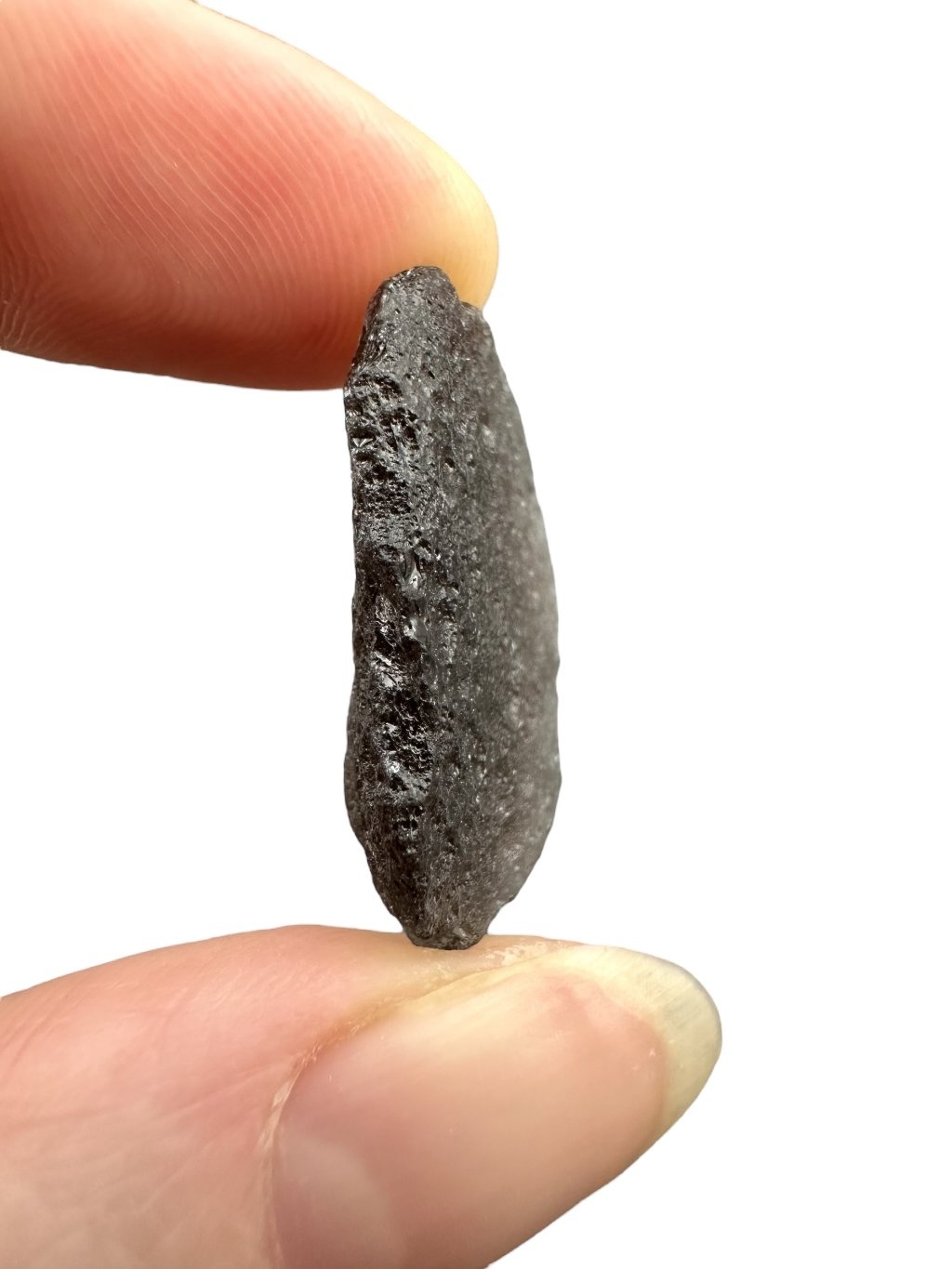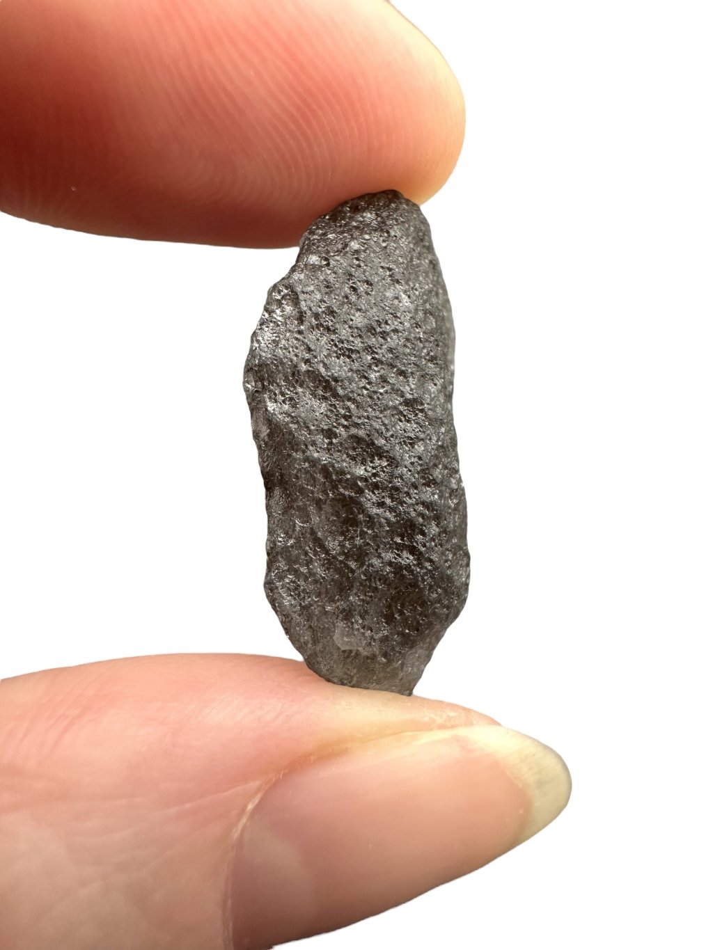 Dieser Stein hat eine dunkle, fast undurchsichtige Farbe, die von grau bis schwarz reicht. Die Oberfläche kann glasig und strukturiert sein, manchmal mit winzigen Bläschen, was typisch für Tektite ist.
