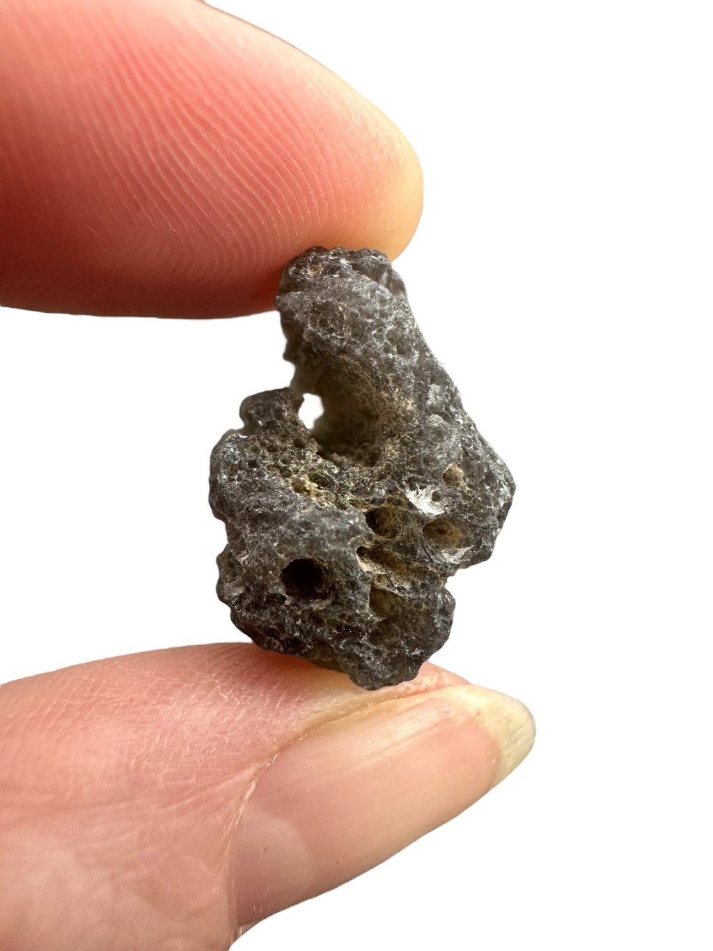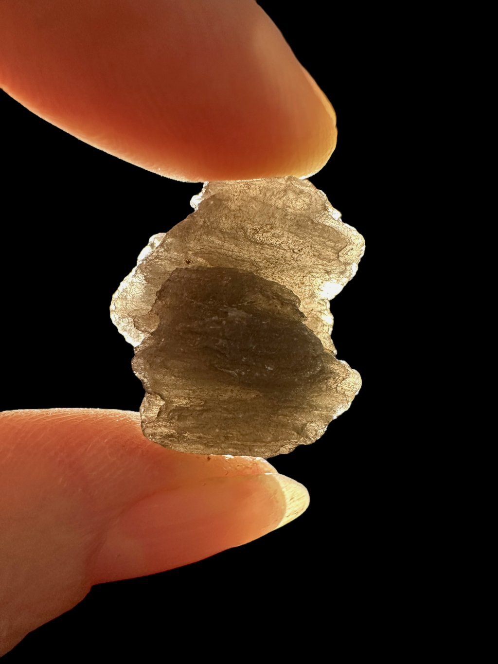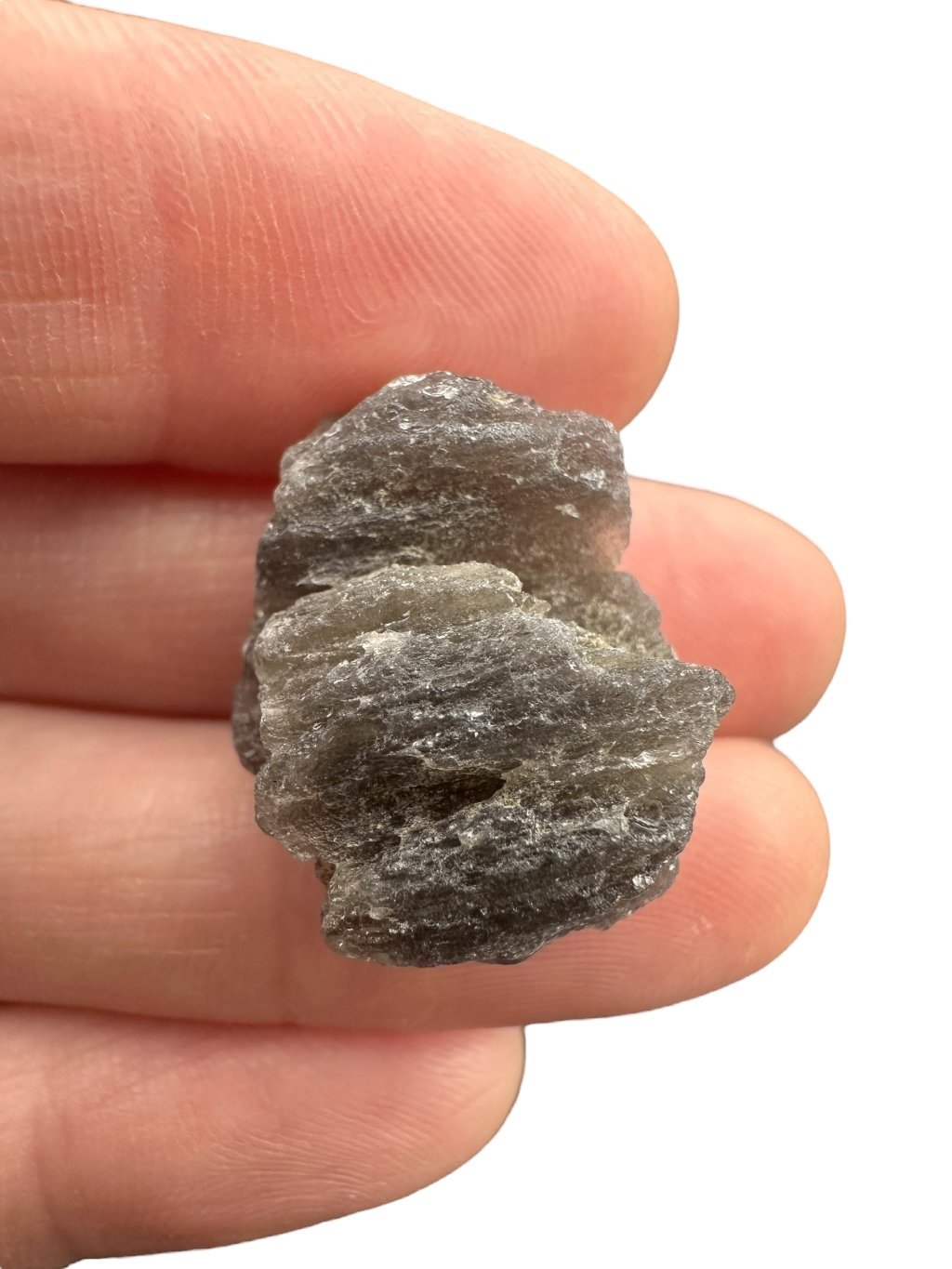 Dieser Stein hat eine dunkle, fast undurchsichtige Farbe, die von grau bis schwarz reicht. Die Oberfläche kann glasig und strukturiert sein, manchmal mit winzigen Bläschen, was typisch für Tektite ist.