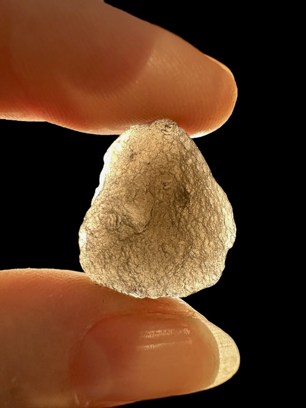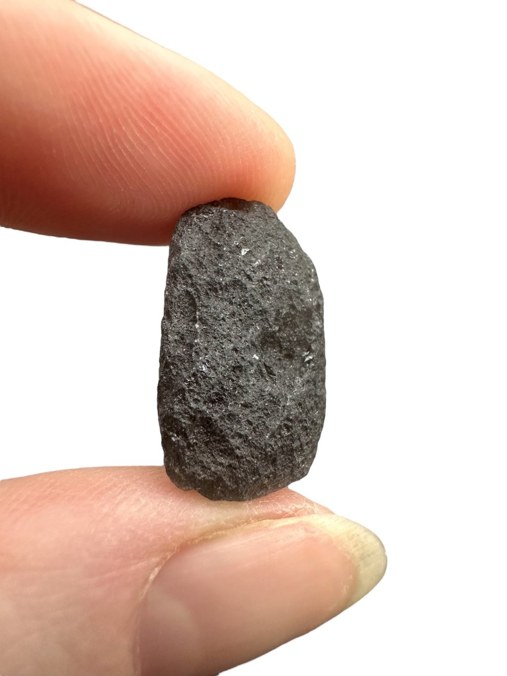 Dieser Stein hat eine dunkle, fast undurchsichtige Farbe, die von grau bis schwarz reicht. Die Oberfläche kann glasig und strukturiert sein, manchmal mit winzigen Bläschen, was typisch für Tektite ist.