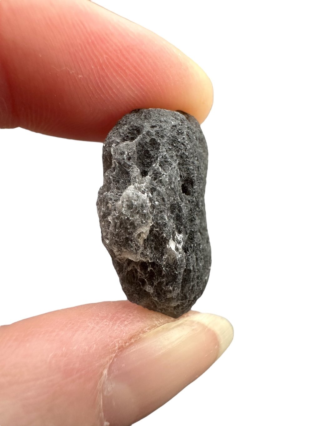 Dieser Stein hat eine dunkle, fast undurchsichtige Farbe, die von grau bis schwarz reicht. Die Oberfläche kann glasig und strukturiert sein, manchmal mit winzigen Bläschen, was typisch für Tektite ist.