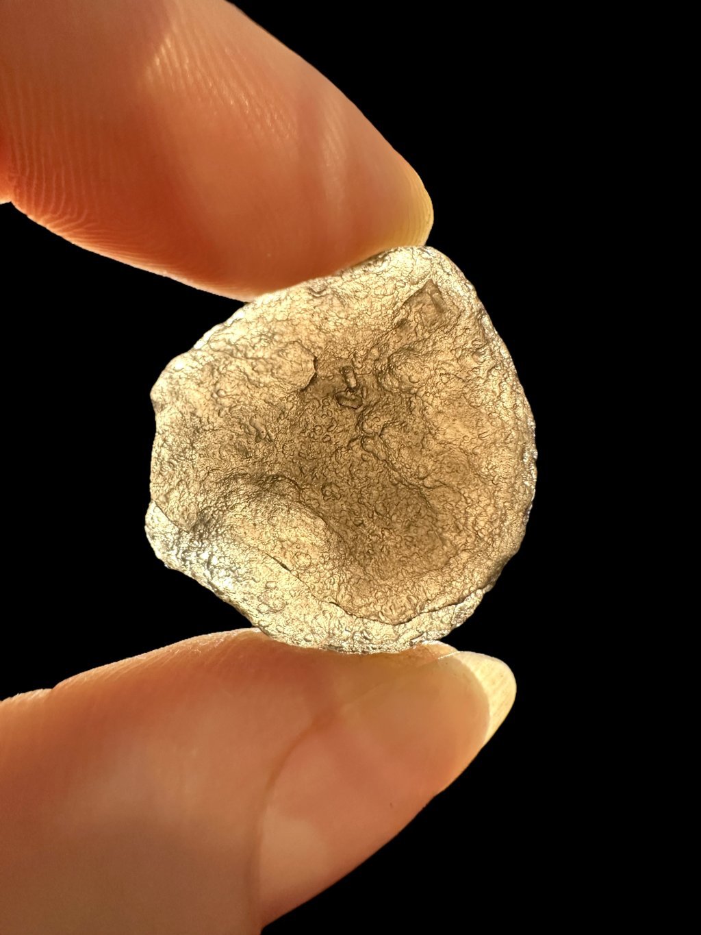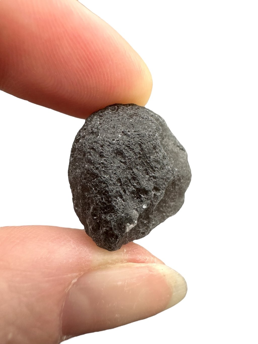 Dieser Stein hat eine dunkle, fast undurchsichtige Farbe, die von grau bis schwarz reicht. Die Oberfläche kann glasig und strukturiert sein, manchmal mit winzigen Bläschen, was typisch für Tektite ist.