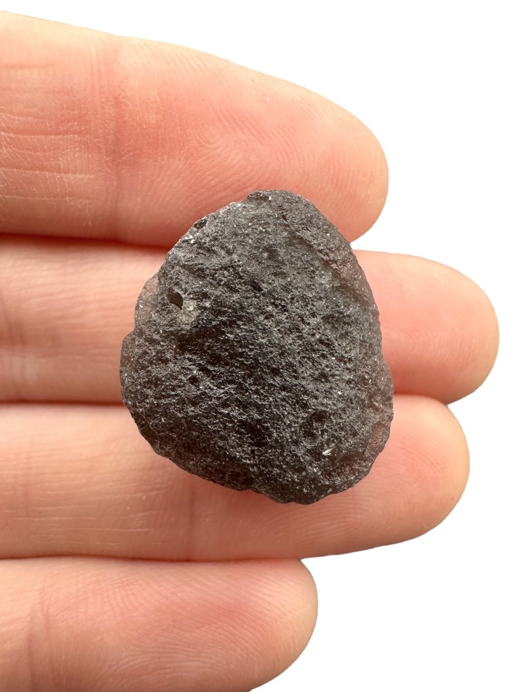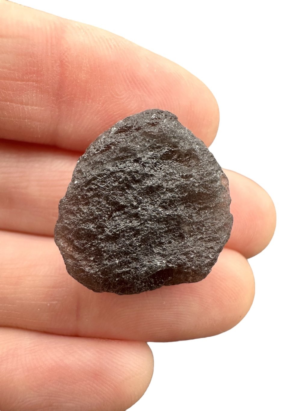 Dieser Stein hat eine dunkle, fast undurchsichtige Farbe, die von grau bis schwarz reicht. Die Oberfläche kann glasig und strukturiert sein, manchmal mit winzigen Bläschen, was typisch für Tektite ist.