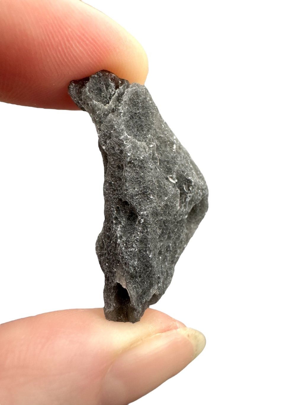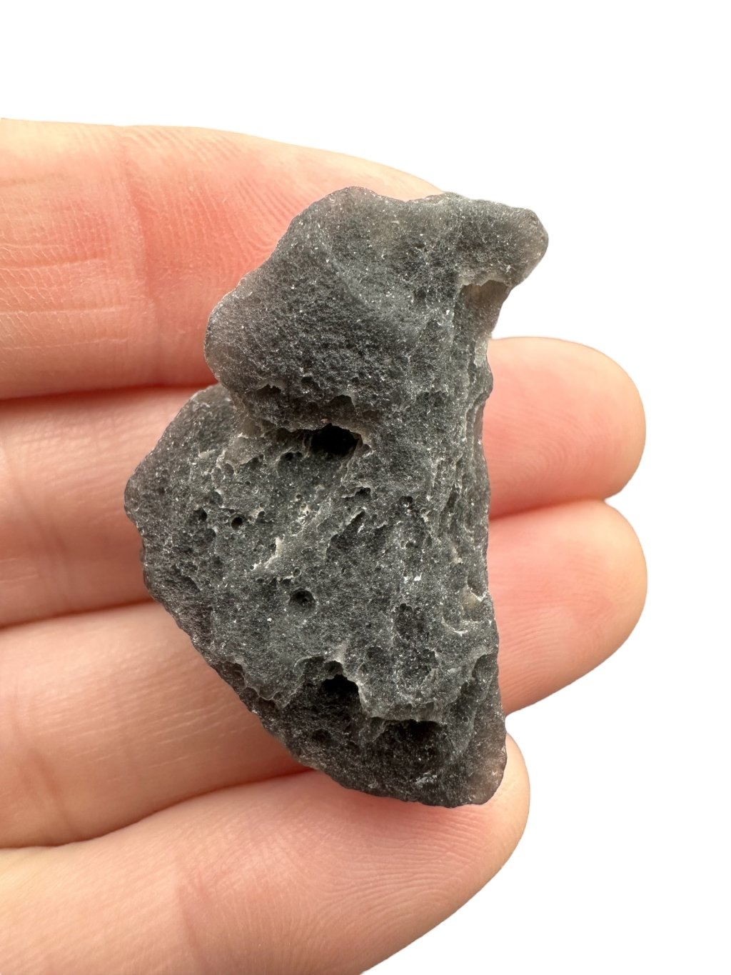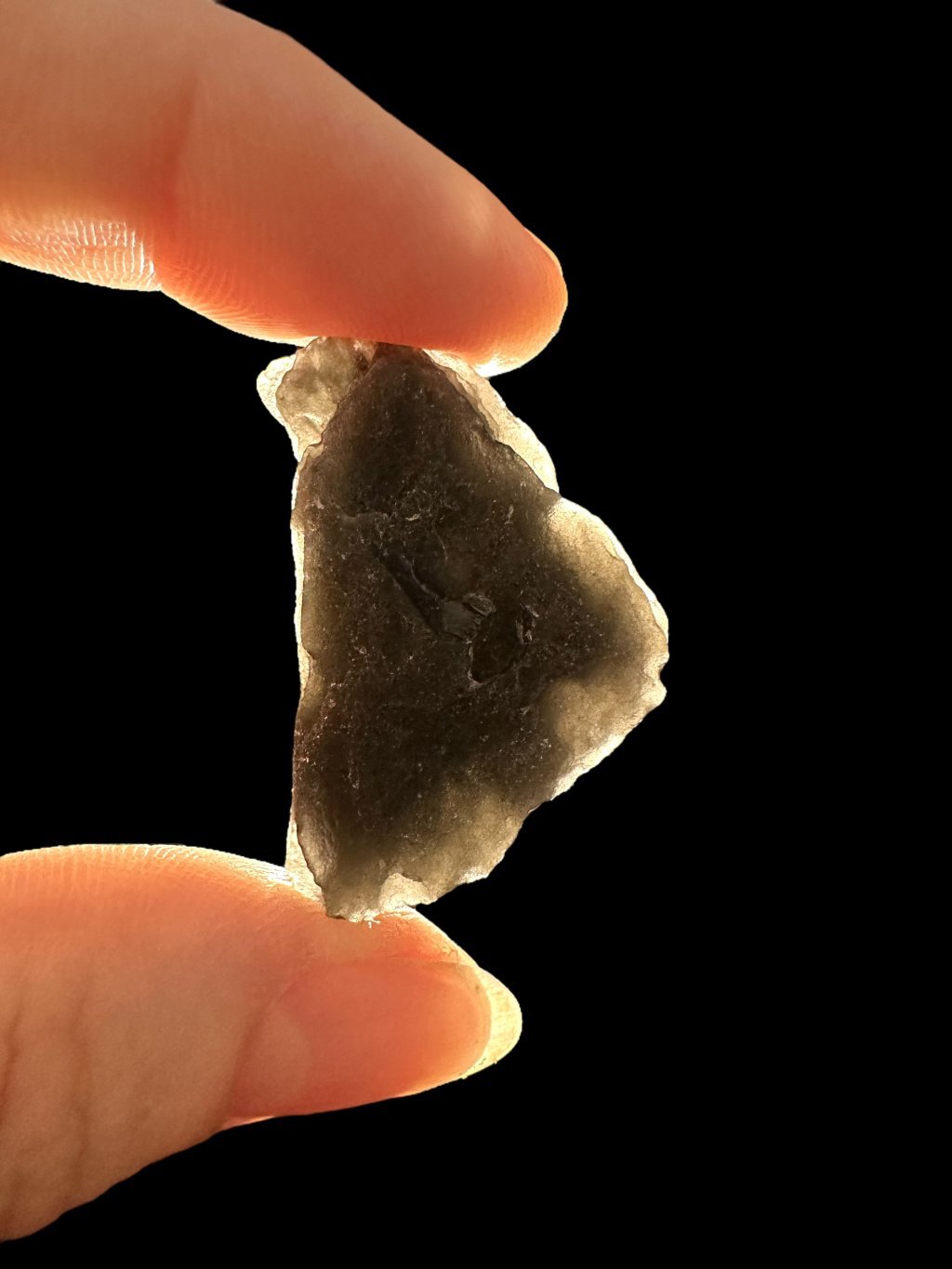 Dieser Stein hat eine dunkle, fast undurchsichtige Farbe, die von grau bis schwarz reicht. Die Oberfläche kann glasig und strukturiert sein, manchmal mit winzigen Bläschen, was typisch für Tektite ist.