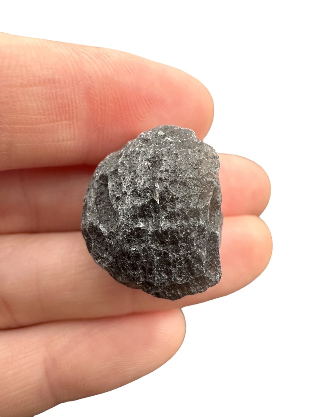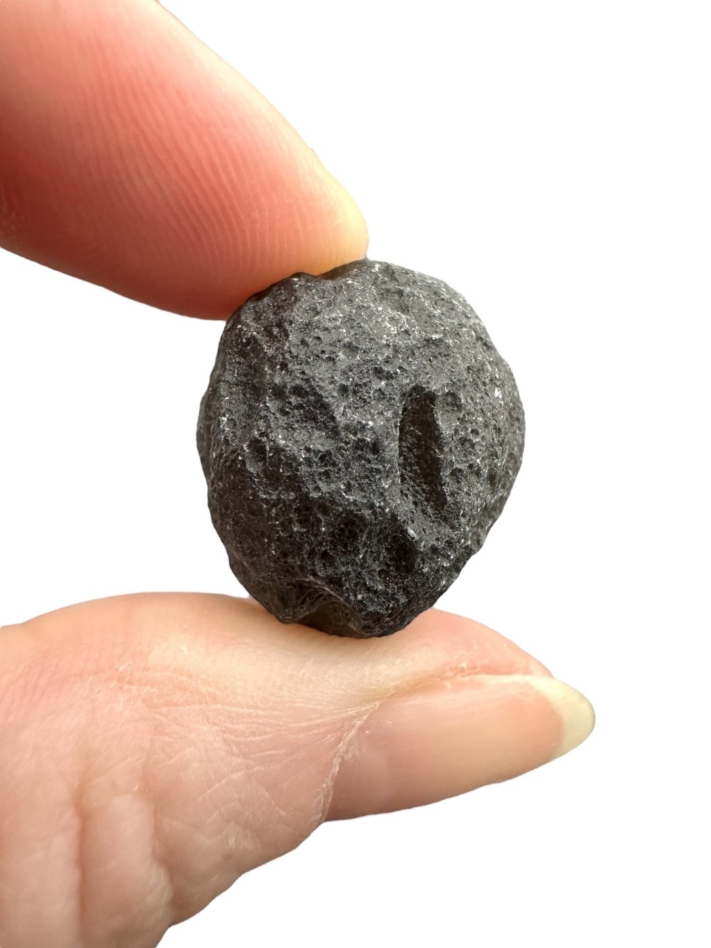 Dieser Stein hat eine dunkle, fast undurchsichtige Farbe, die von grau bis schwarz reicht. Die Oberfläche kann glasig und strukturiert sein, manchmal mit winzigen Bläschen, was typisch für Tektite ist.