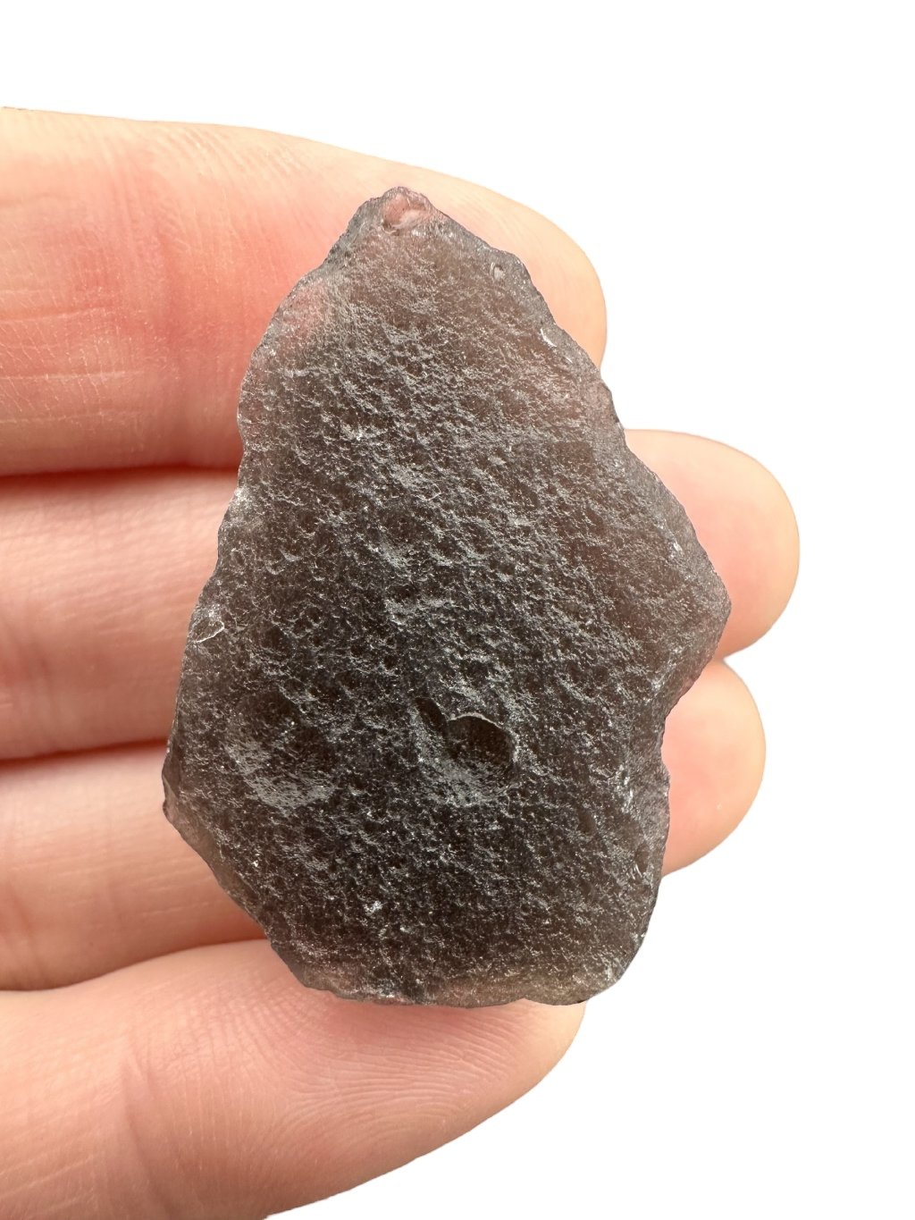 Dieser Stein hat eine dunkle, fast undurchsichtige Farbe, die von grau bis schwarz reicht. Die Oberfläche kann glasig und strukturiert sein, manchmal mit winzigen Bläschen, was typisch für Tektite ist.