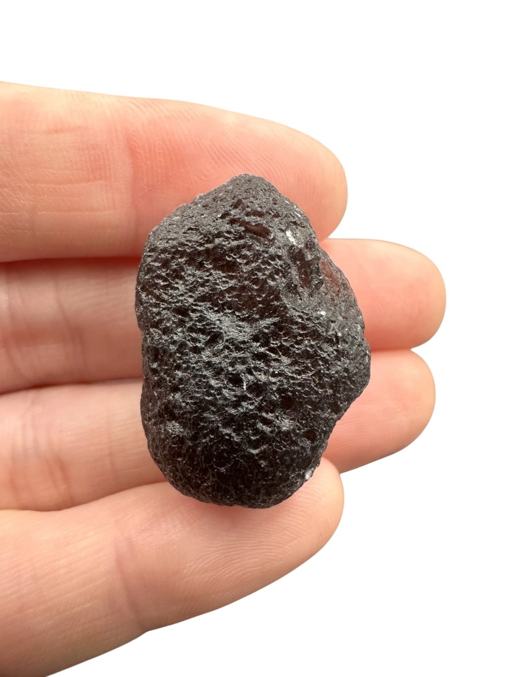 Dieser Stein hat eine dunkle, fast undurchsichtige Farbe, die von grau bis schwarz reicht. Die Oberfläche kann glasig und strukturiert sein, manchmal mit winzigen Bläschen, was typisch für Tektite ist.