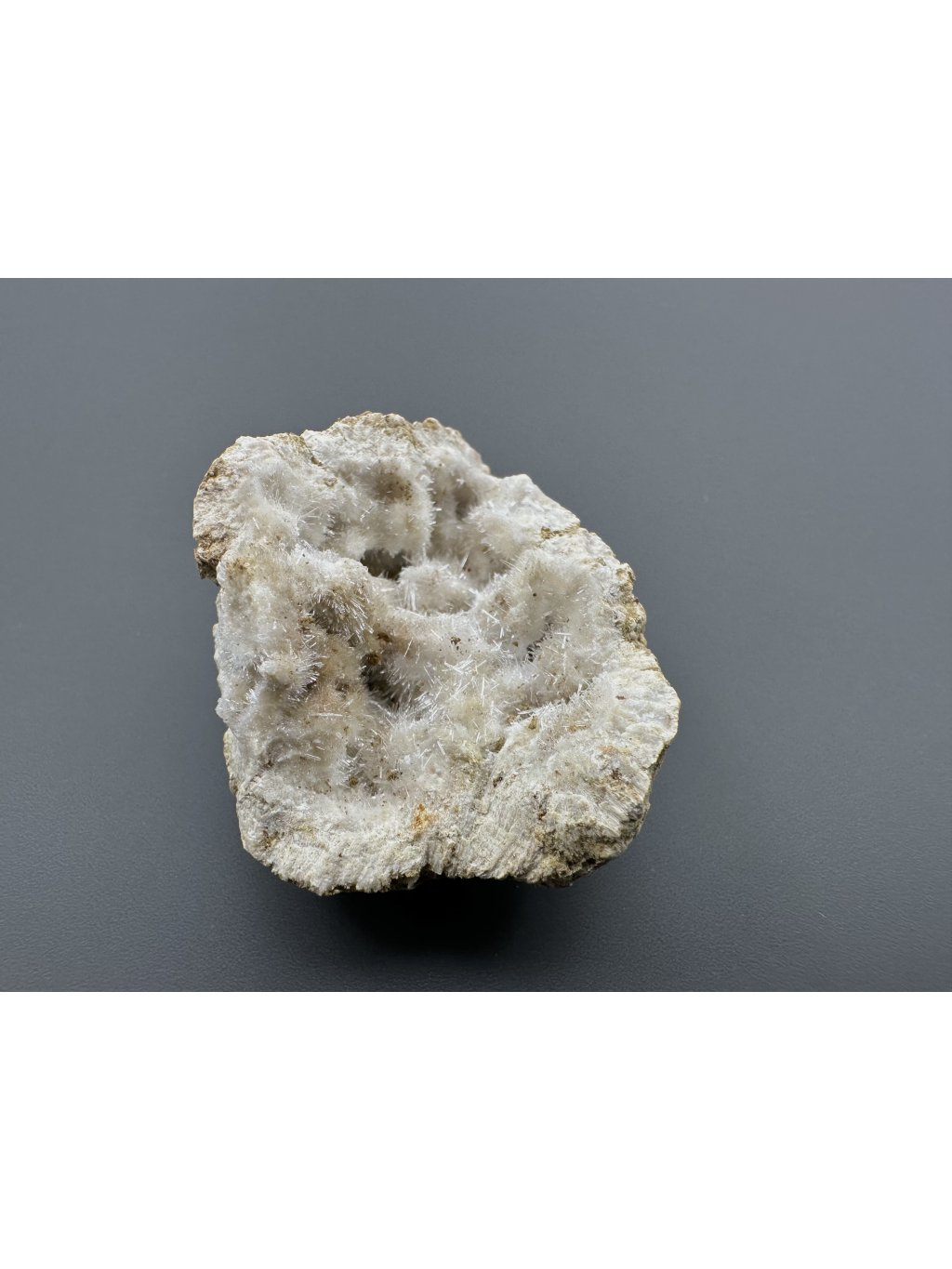 Aragonit aus Braňany gehört zu den bekanntesten tschechischen Fundorten dieses Minerals. Er kommt im Böhmischen Mittelgebirge nahe der Stadt Most vor, wo er sich in Basaltspalten und an der Kontaktzone mit Bentonit bildet. Typisch sind faserige und nadelige Kristalle mit einem metallisch weißen bis grauen Glanz, die oft strahlenförmige, fächerartige oder rosettenähnliche Aggregate bilden.