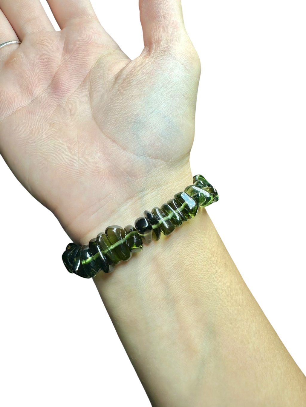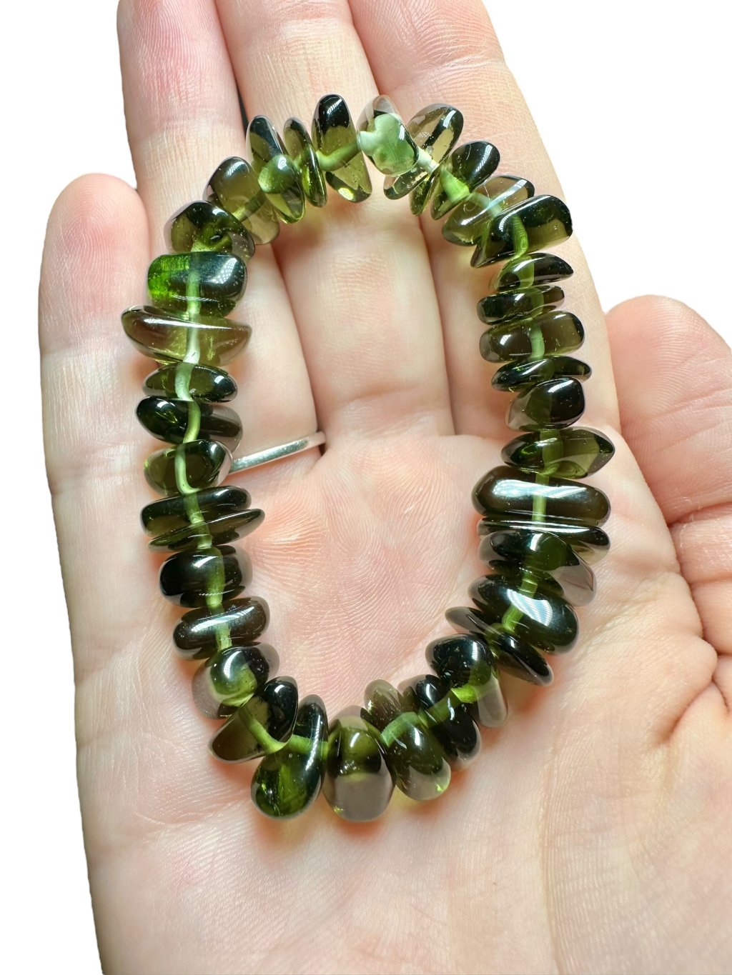 Die Moldavite sind auf einem Gummiband aufgefädelt