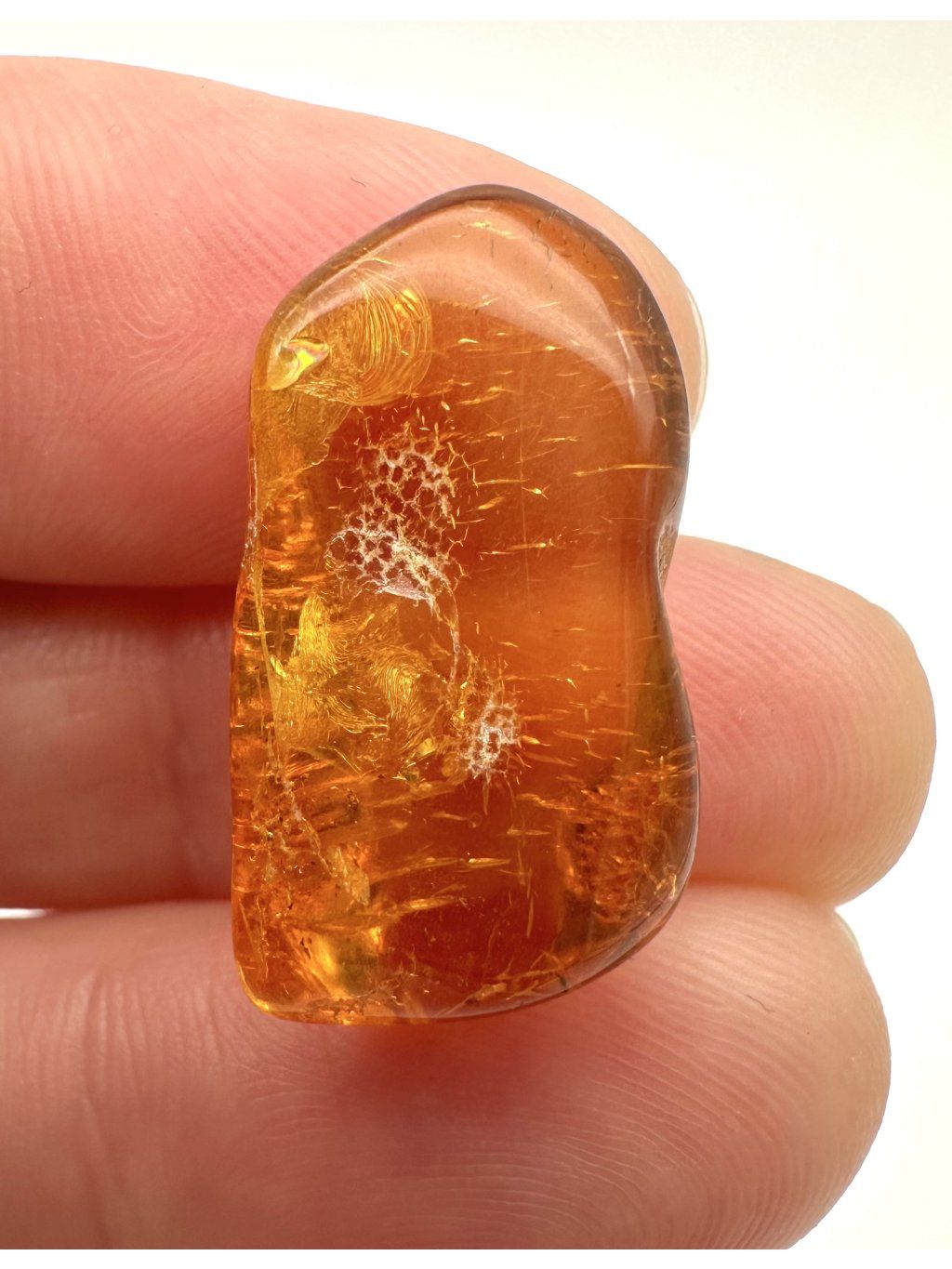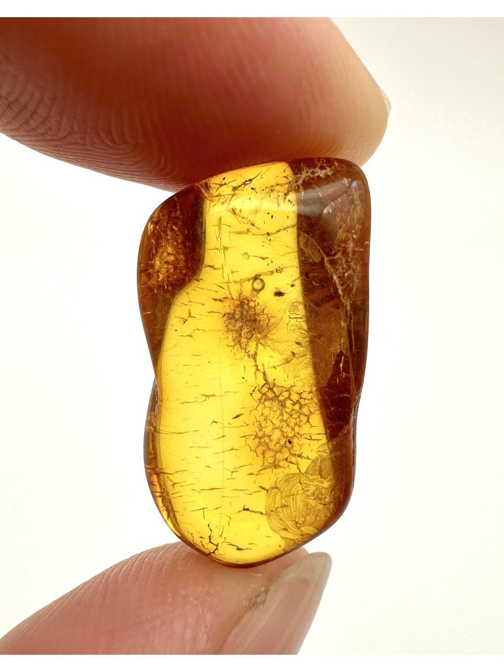 Polnischer Bernstein ist auch für seine besonders gut erhaltenen Einschlüsse bekannt. Zu den häufigsten gehören kleine fossile Insekten aus der Urzeit – etwa Fliegen, Mücken, Wespen, Käfer, Termiten oder Ameisen. Diese Exemplare zeigen oft feinste Details von Körper und Flügeln. Seltener, aber sehr interessant sind pflanzliche Einschlüsse wie Nadelbaumnadeln, Pollenkörner, Blattfragmente, Moose oder Flechten. Diese Überreste stammen aus prähistorischen Wäldern, die einst Nordeuropa bedeckten. Ebenfalls selten, aber beeindruckend, sind Spinnen, Hundertfüßer, Milben oder Larven.