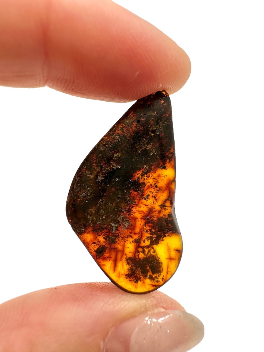 Notiz: Das Titelbild wurde aufgenommen, während der Bernstein zwischen den Fingern gehalten wurde, sodass Licht hindurchscheint und er heller wirkt, als wenn er auf einer Oberfläche liegt.“