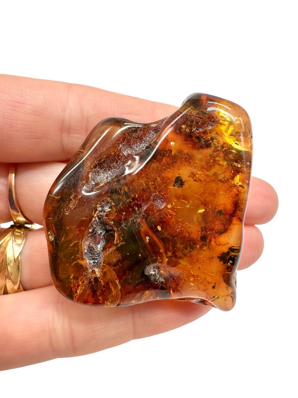 Litauischer Bernstein ist durch seine markante Farbe bekannt, die häufig von hell- bis dunkelgelb reicht und in honigfarbene oder orangefarbene Töne übergeht. Es gibt auch dunklere Varianten – von braun bis nahezu schwarz – sowie seltenere Ausführungen in fast weiß oder grünlich. Aufgrund seines hohen Gehalts an Bernsteinsäure (bis zu etwa 8 %) gilt Baltischer Bernstein im Vergleich zu anderen Typen als hochwertiger. Er enthält oft natürliche Einschlüsse wie Luftblasen, Pflanzenreste oder kleine Insekten, was seinen Sammlerwert und ästhetischen Reiz deutlich steigert.