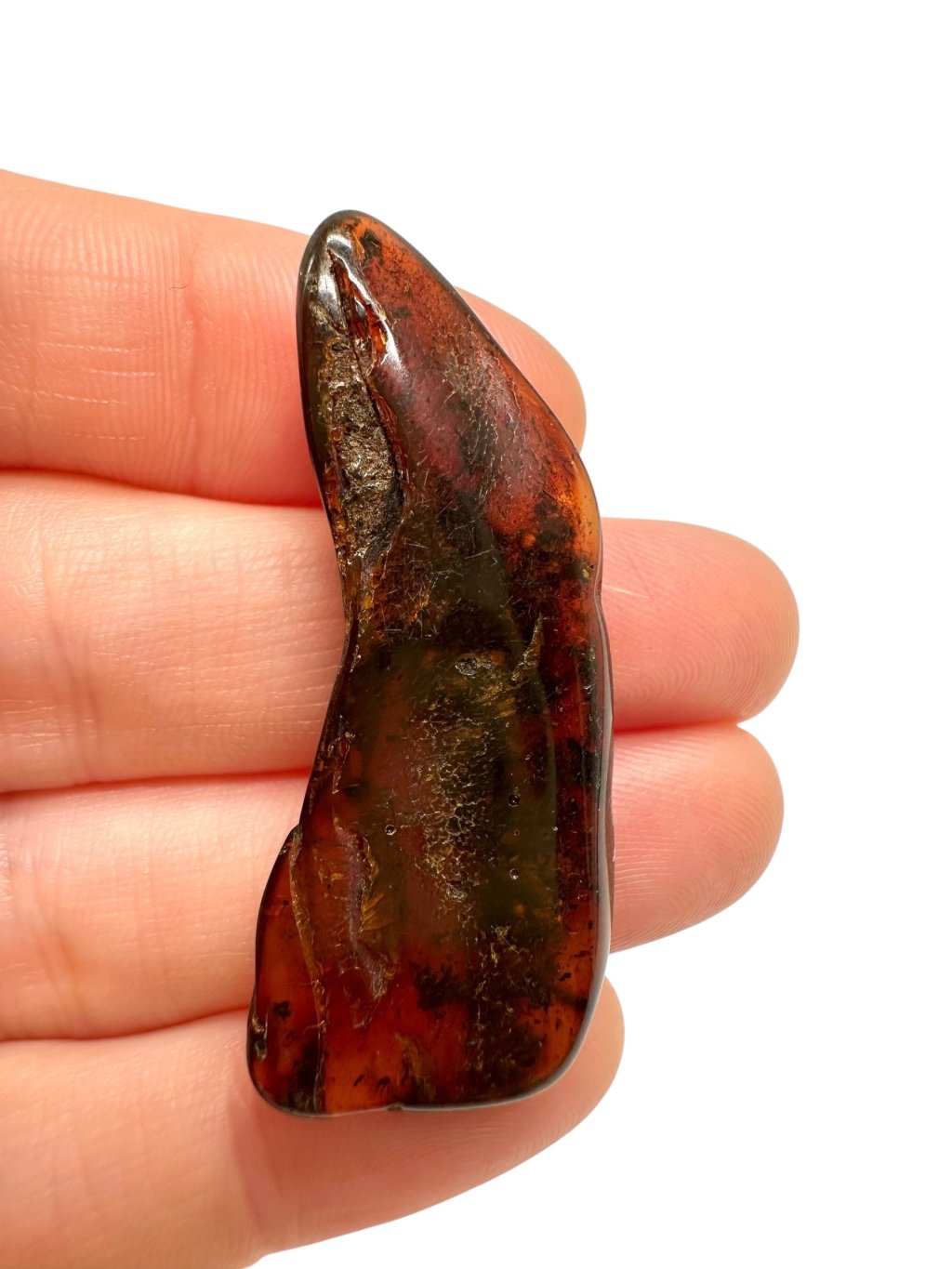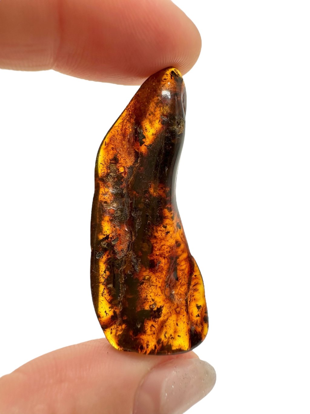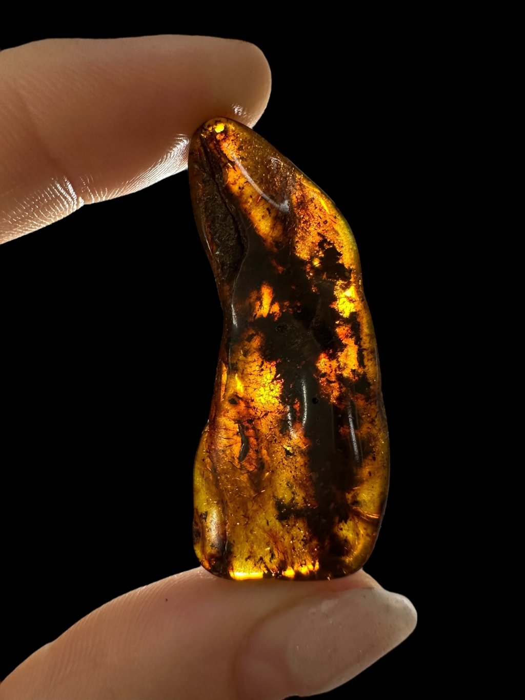 Notiz: Das Titelbild wurde aufgenommen, während der Bernstein zwischen den Fingern gehalten wurde, sodass Licht hindurchscheint und er heller wirkt, als wenn er auf einer Oberfläche liegt.“