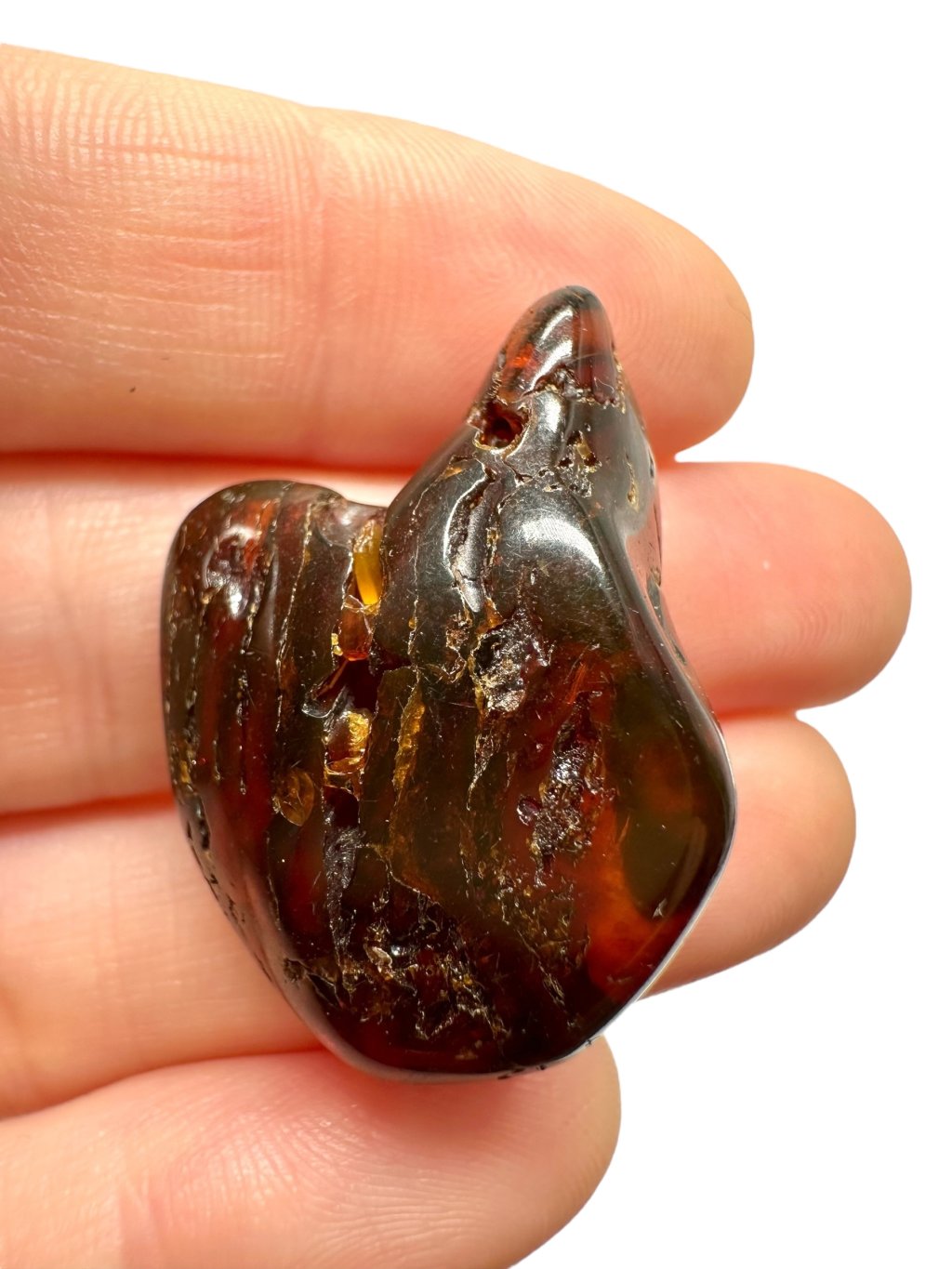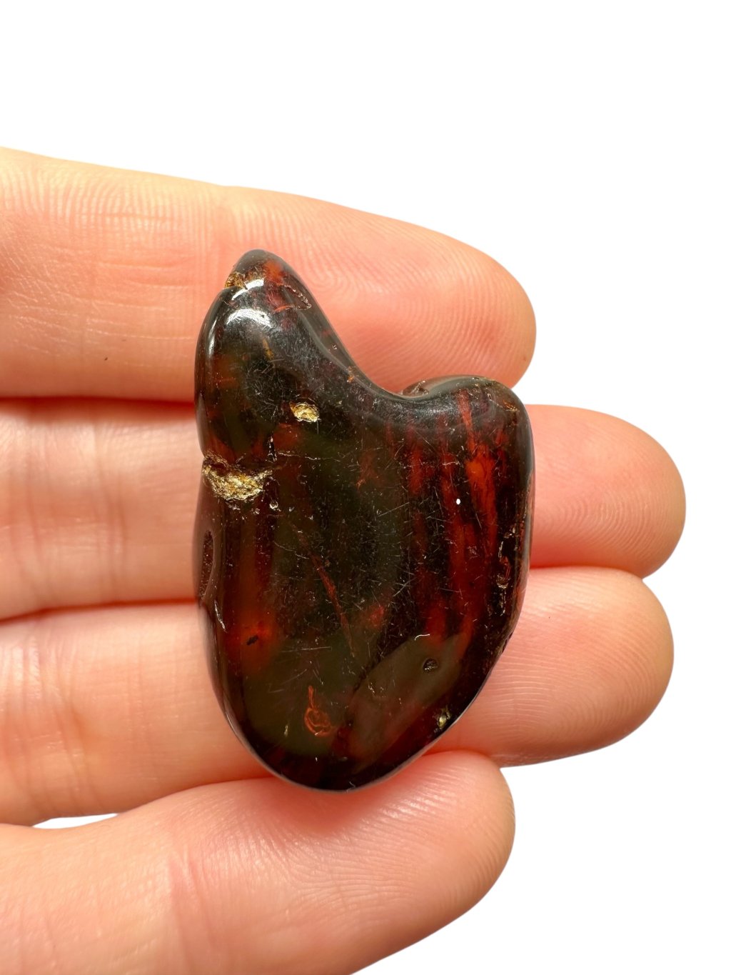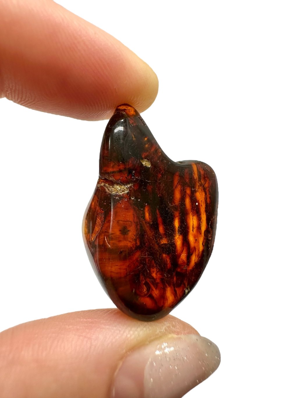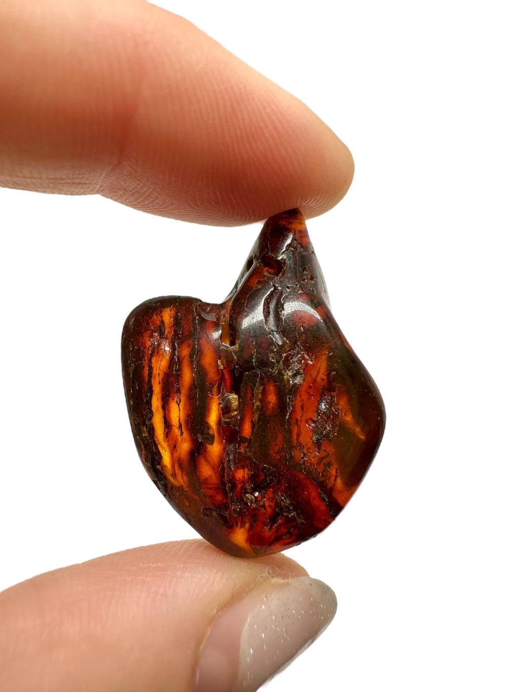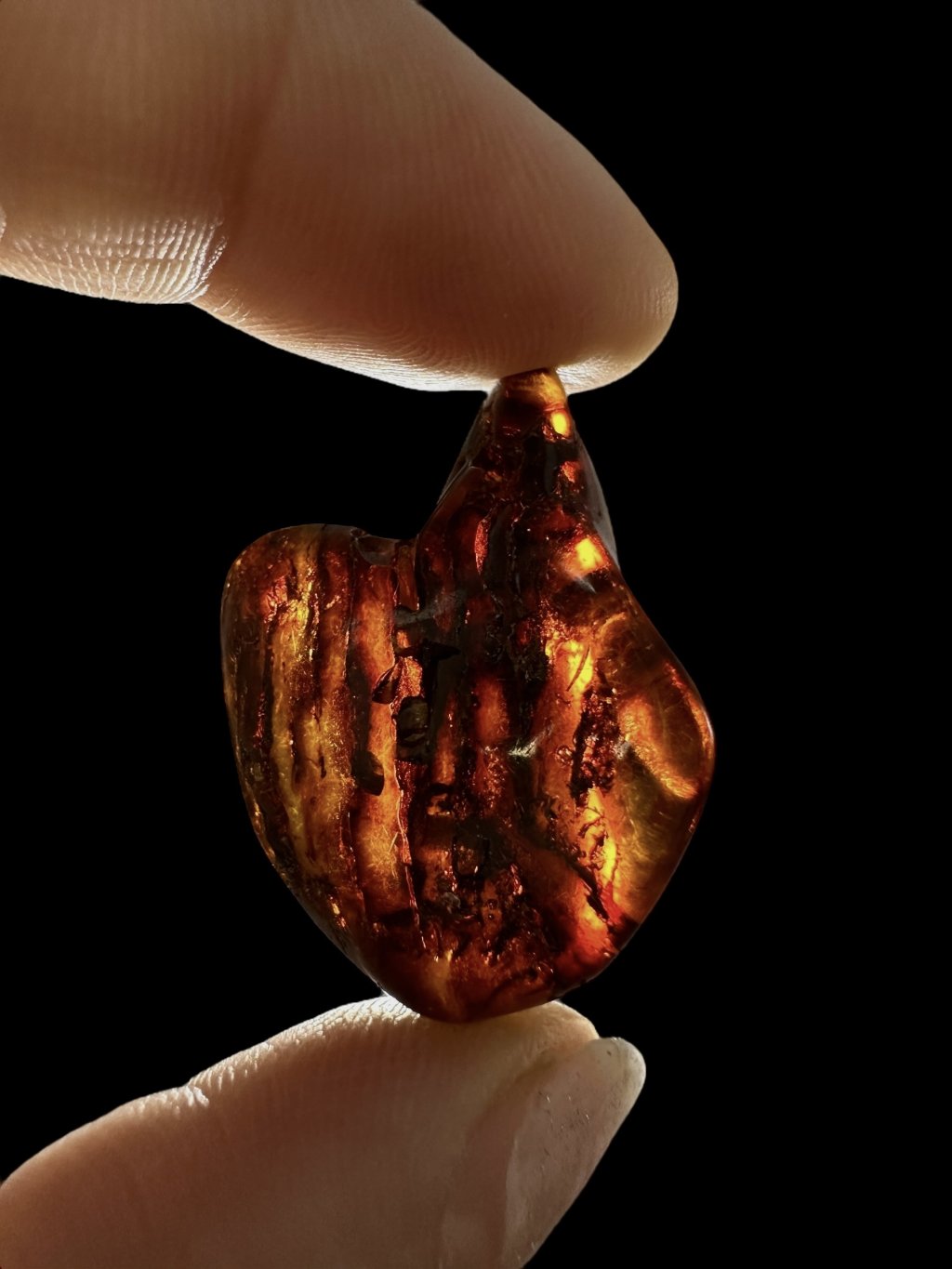 Notiz: Das Titelbild wurde aufgenommen, während der Bernstein zwischen den Fingern gehalten wurde, sodass Licht hindurchscheint und er heller wirkt, als wenn er auf einer Oberfläche liegt.“
