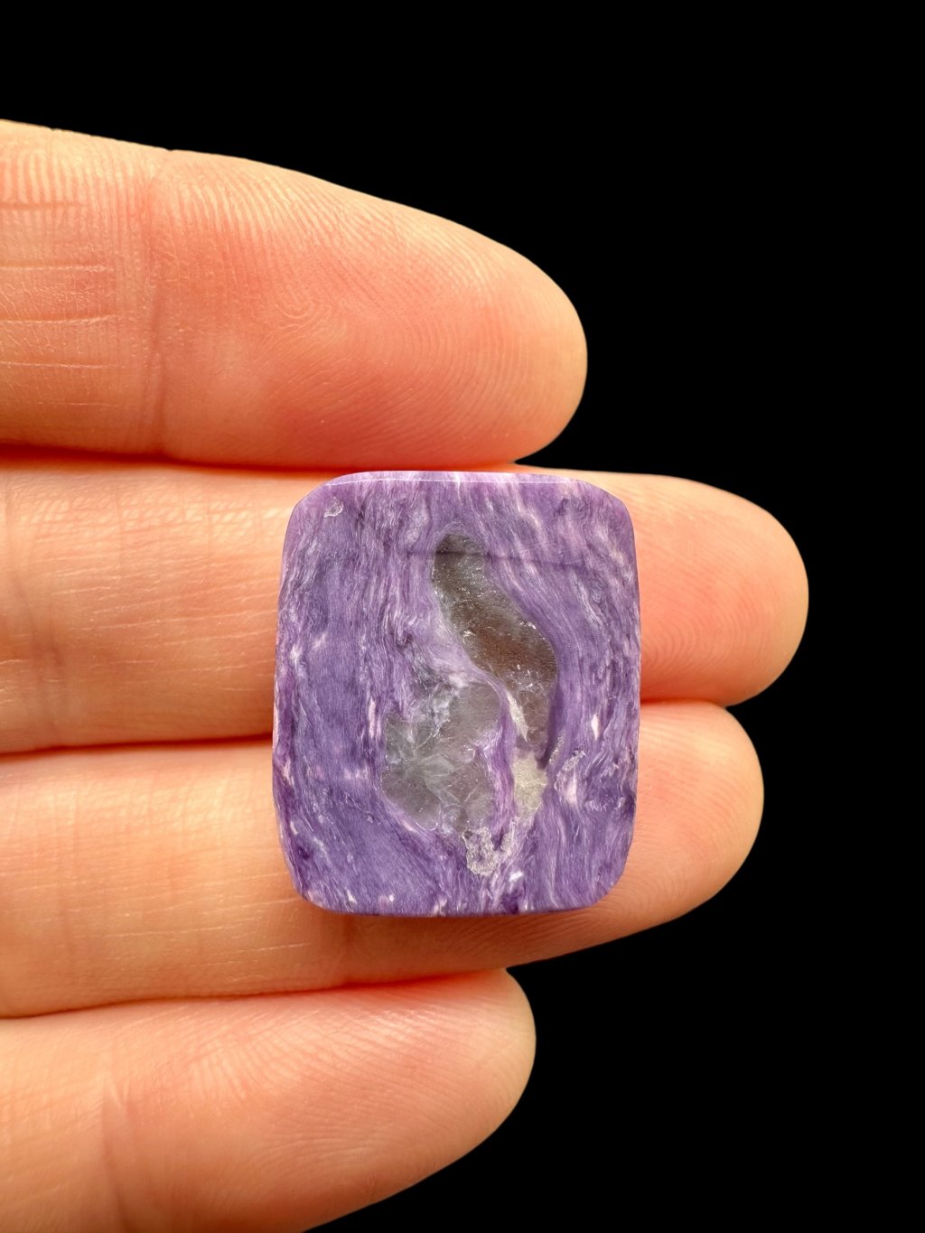 Cabochon ist eine spezielle Art des Schliffs ohne Facetten, mit einer glatten, abgerundeten und polierten Oberfläche. Diese Art der Bearbeitung hebt die natürliche Farbe, Zeichnung und den seidigen Glanz des Minerals hervor. Charoit-Cabochons sind besonders beliebt bei der Herstellung von Ringen, Anhängern, Ohrringen oder Armbändern. Dank seiner Härte von 5 bis 6 auf der Mohs-Skala eignet sich Charoit vor allem für Schmuck, der keiner übermäßigen mechanischen Belastung ausgesetzt ist. Jeder Cabochon ist aufgrund seiner einzigartigen Zeichnung und Farbstruktur ein Unikat.