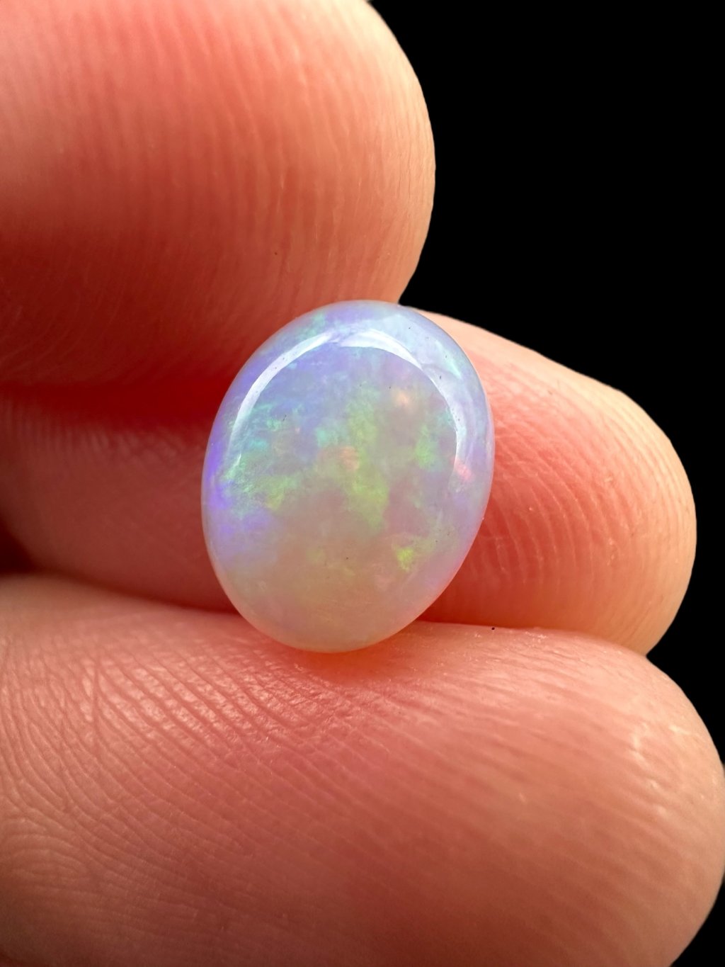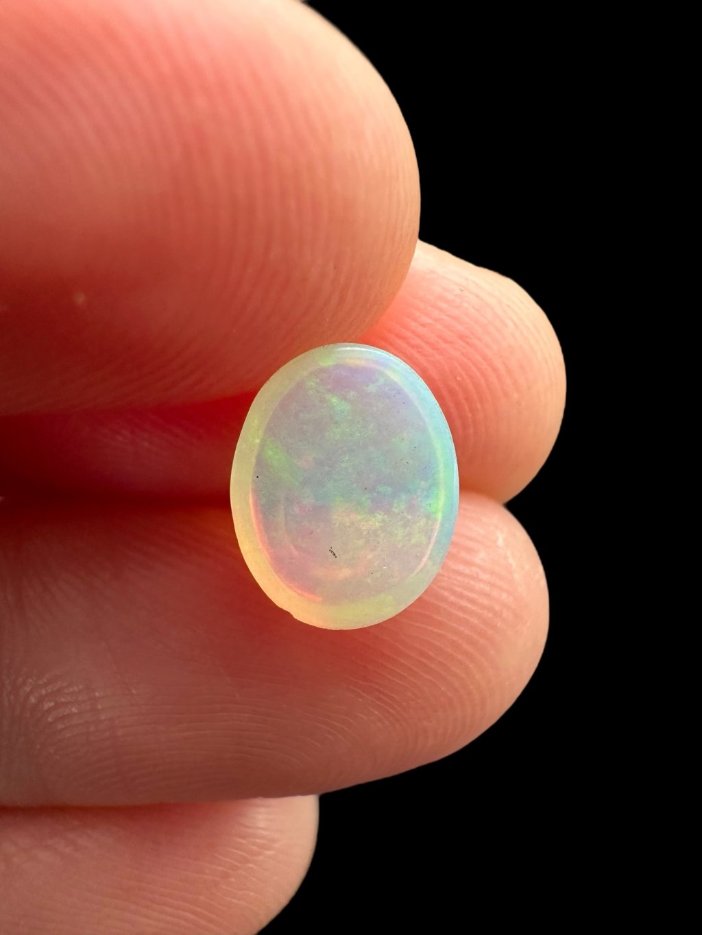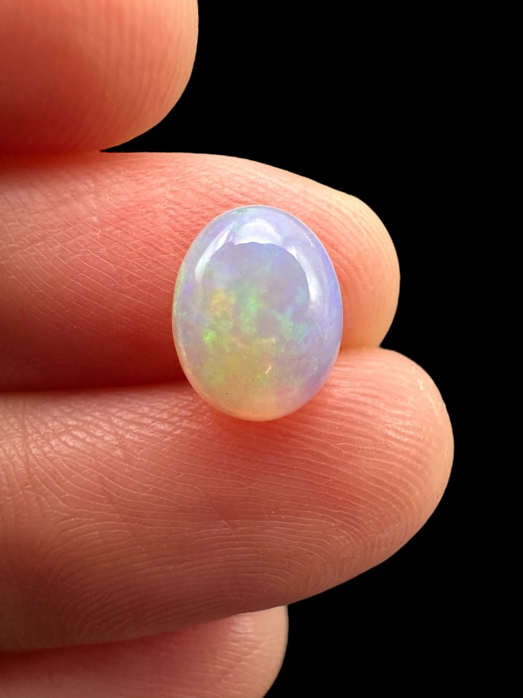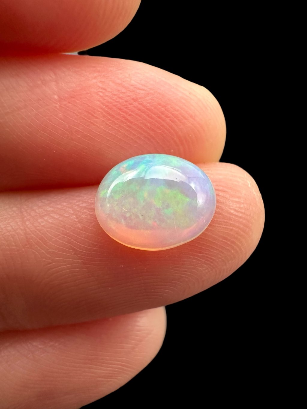 Äthiopische Kabochen können mit einer breiten Farbpalette aufwarten – von hellen, milchig-weißen Tönen über Gelb und Orange bis hin zu intensiven roten und grünen Reflexen. Viele Steine zeigen sogar seltene blaue oder violette Farbspiele. Dank des Kabochen-Schliffs fließen die Farben sanft über die gewölbte Oberfläche.