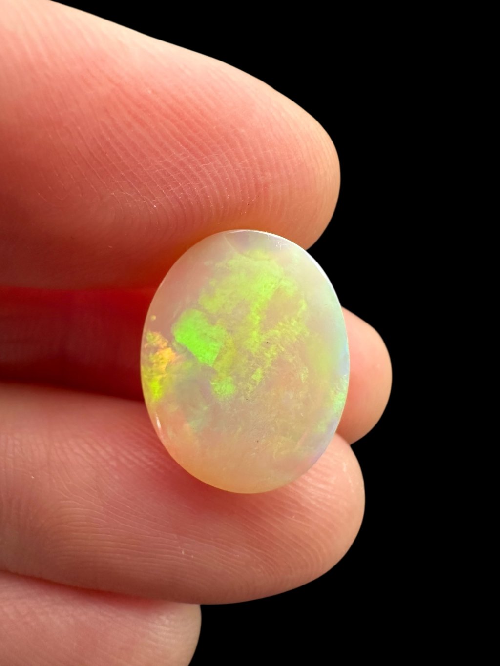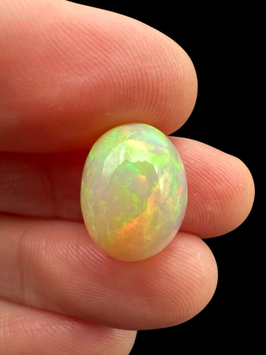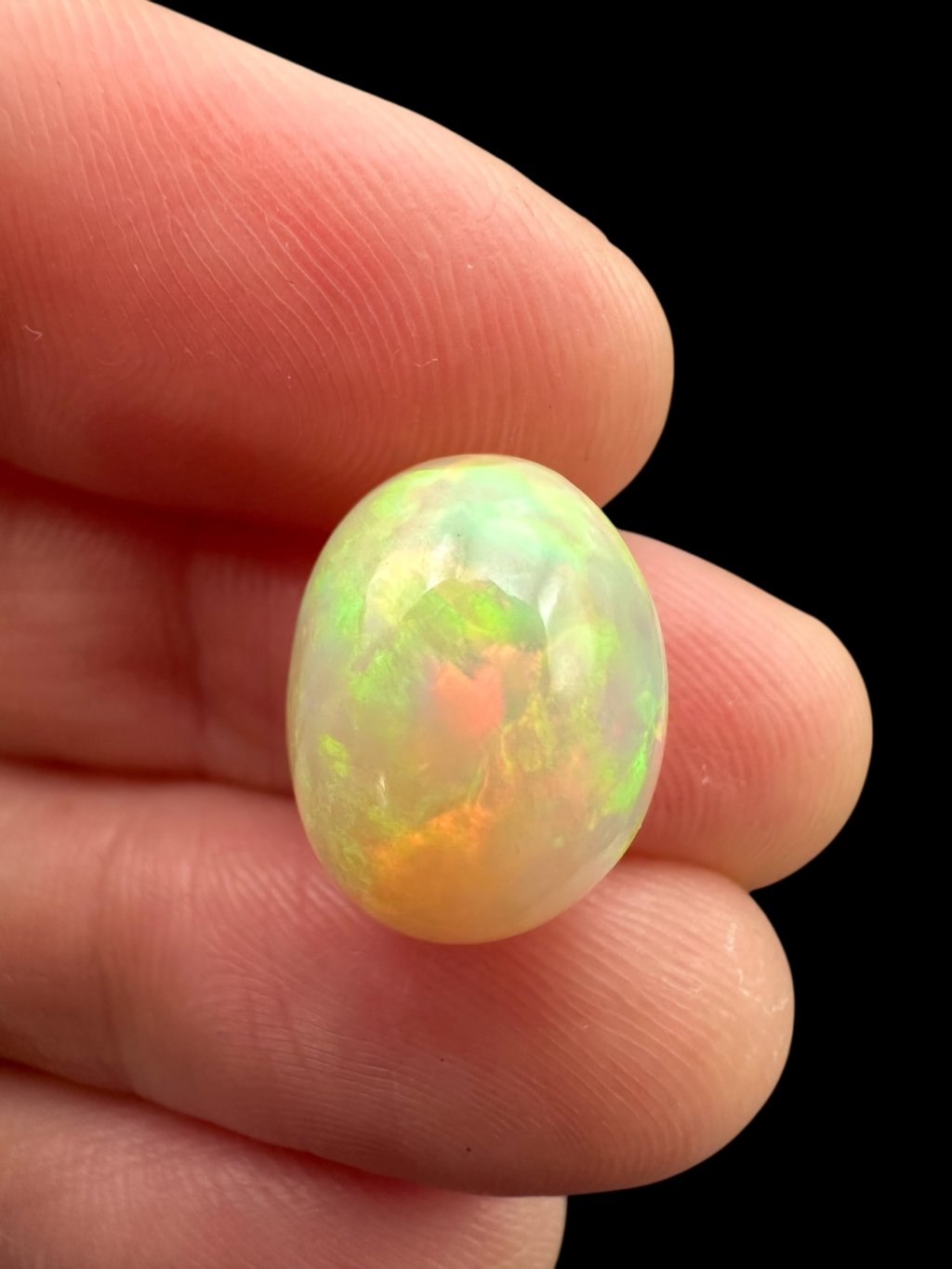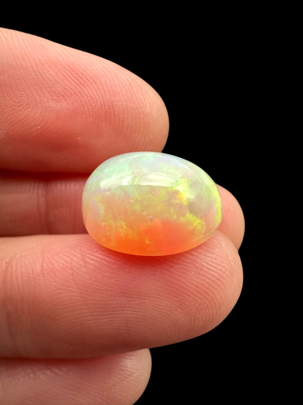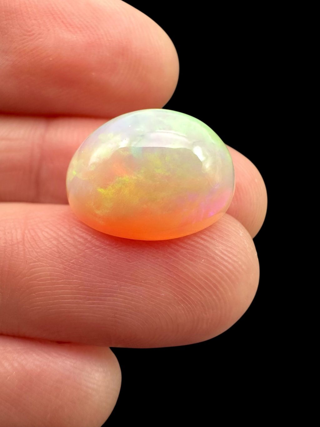 Äthiopische Kabochen können mit einer breiten Farbpalette aufwarten – von hellen, milchig-weißen Tönen über Gelb und Orange bis hin zu intensiven roten und grünen Reflexen. Viele Steine zeigen sogar seltene blaue oder violette Farbspiele. Dank des Kabochen-Schliffs fließen die Farben sanft über die gewölbte Oberfläche.