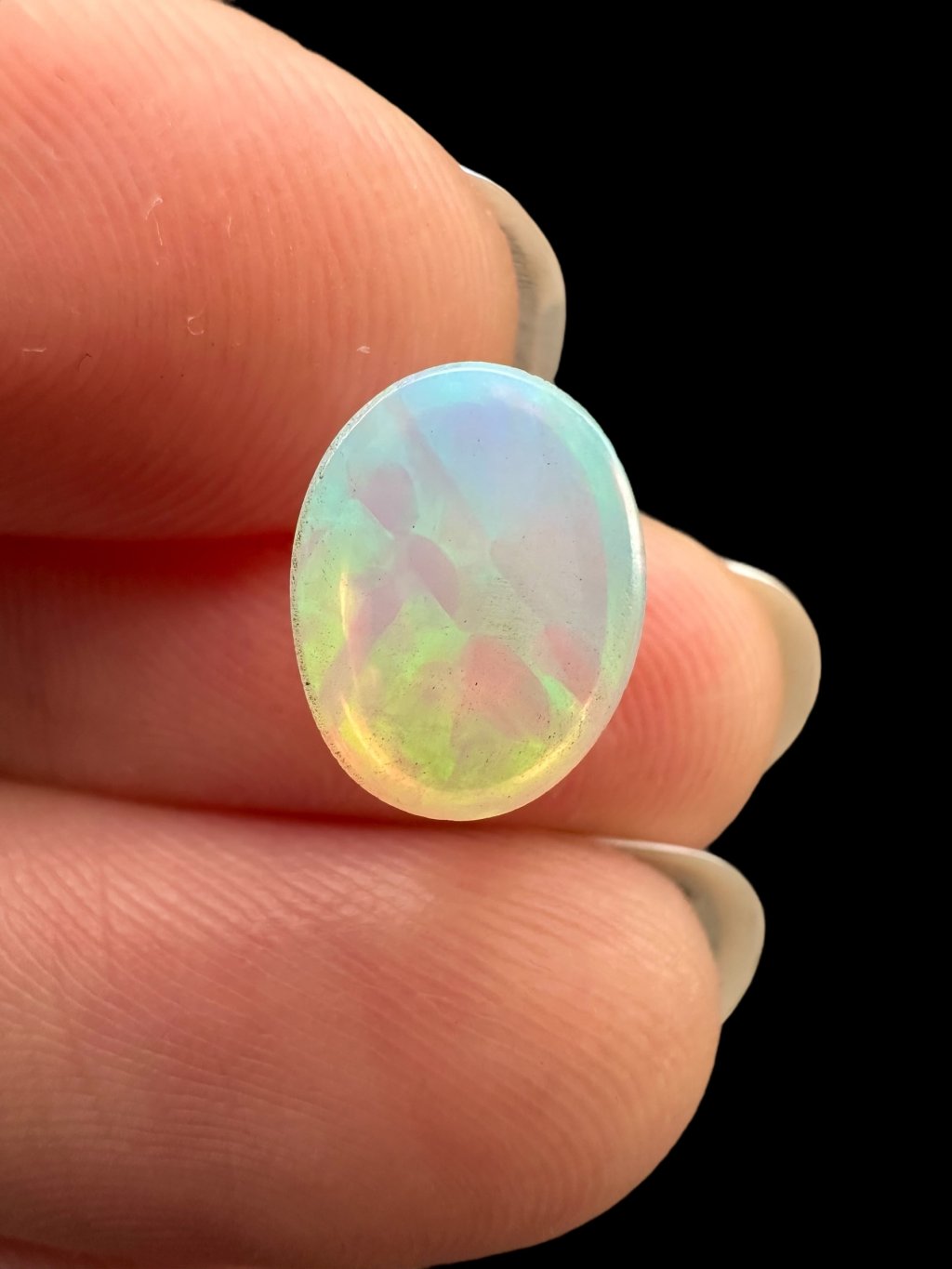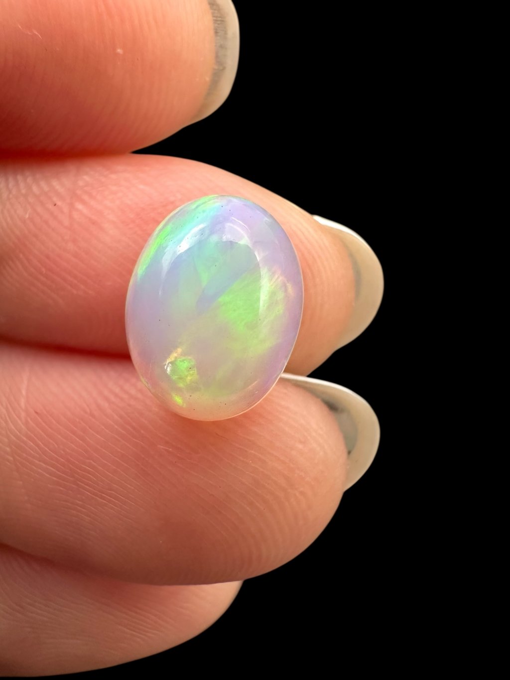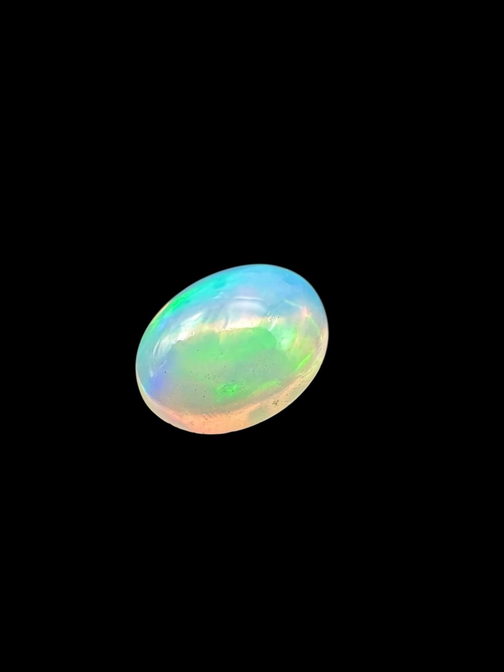 Äthiopische Kabochen können mit einer breiten Farbpalette aufwarten – von hellen, milchig-weißen Tönen über Gelb und Orange bis hin zu intensiven roten und grünen Reflexen. Viele Steine zeigen sogar seltene blaue oder violette Farbspiele. Dank des Kabochen-Schliffs fließen die Farben sanft über die gewölbte Oberfläche.