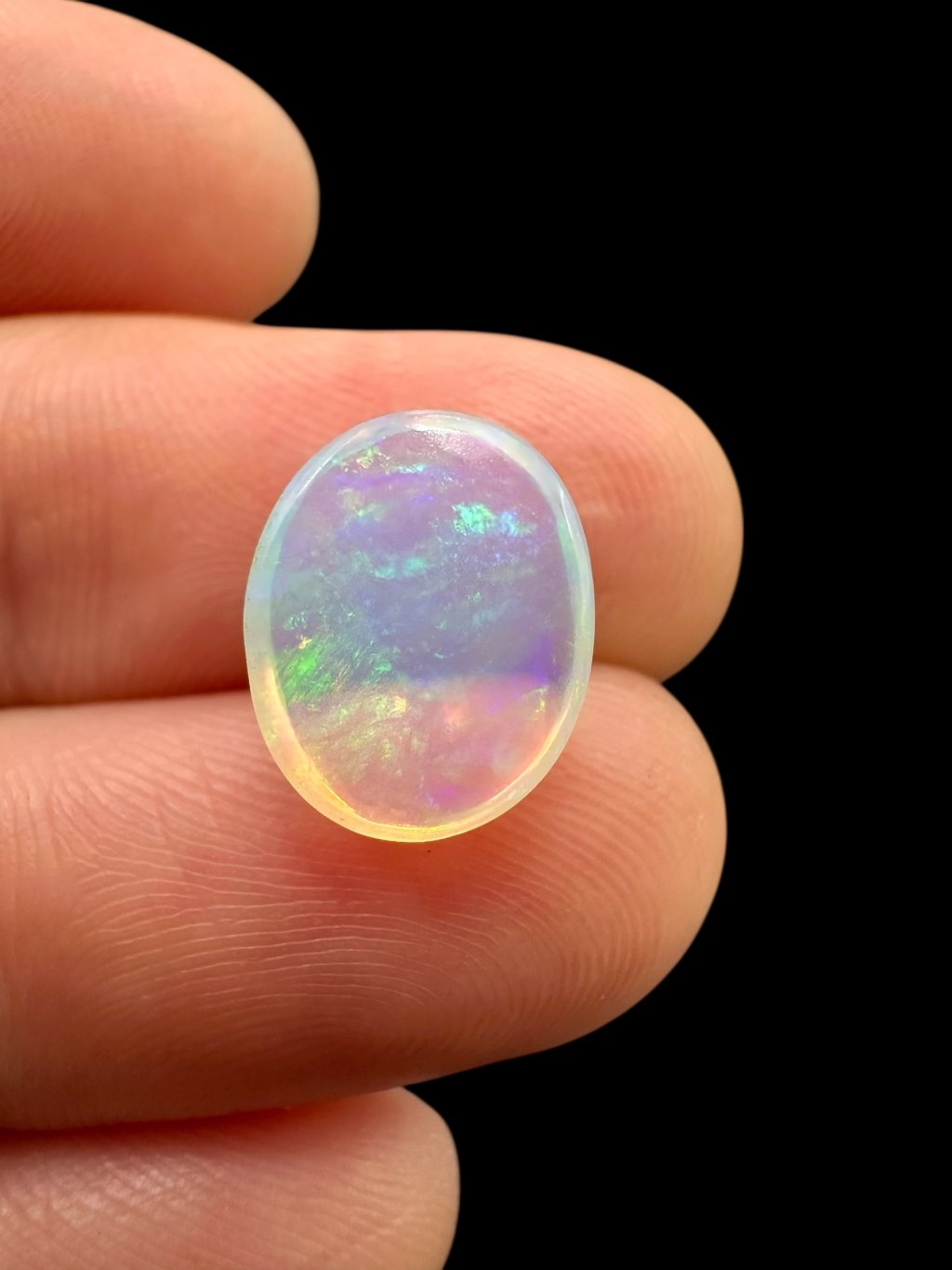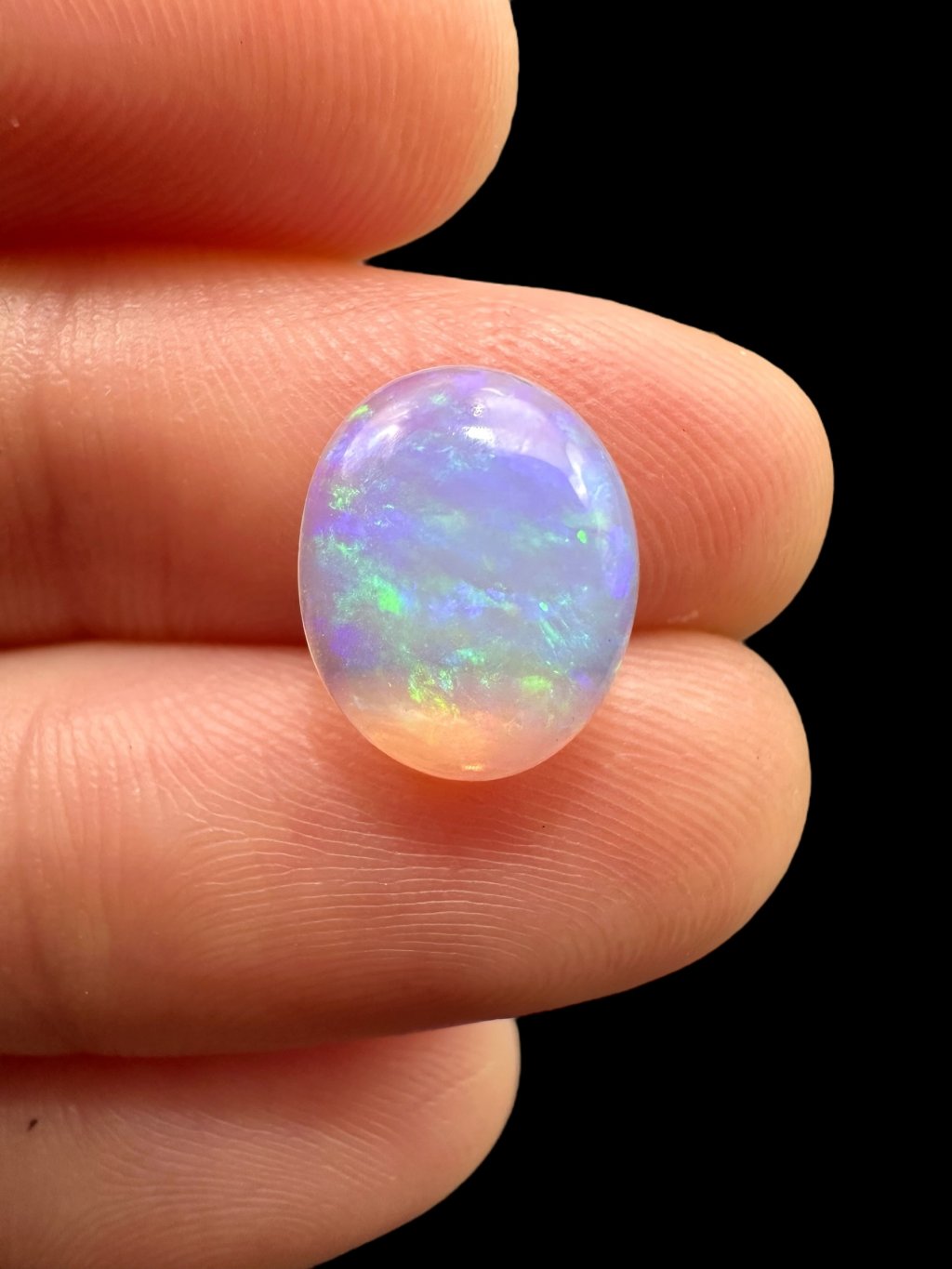Äthiopische Kabochen können mit einer breiten Farbpalette aufwarten – von hellen, milchig-weißen Tönen über Gelb und Orange bis hin zu intensiven roten und grünen Reflexen. Viele Steine zeigen sogar seltene blaue oder violette Farbspiele. Dank des Kabochen-Schliffs fließen die Farben sanft über die gewölbte Oberfläche.