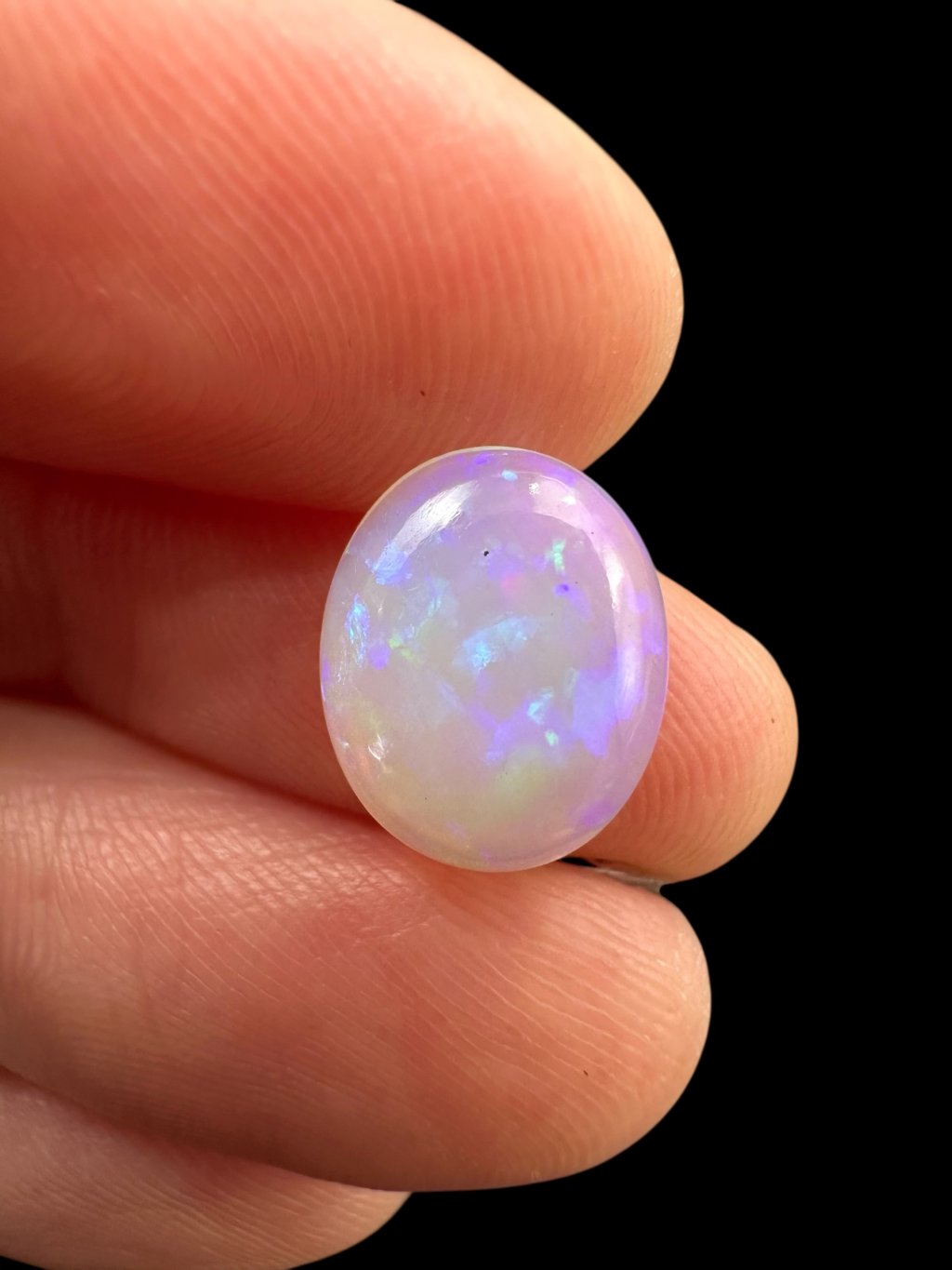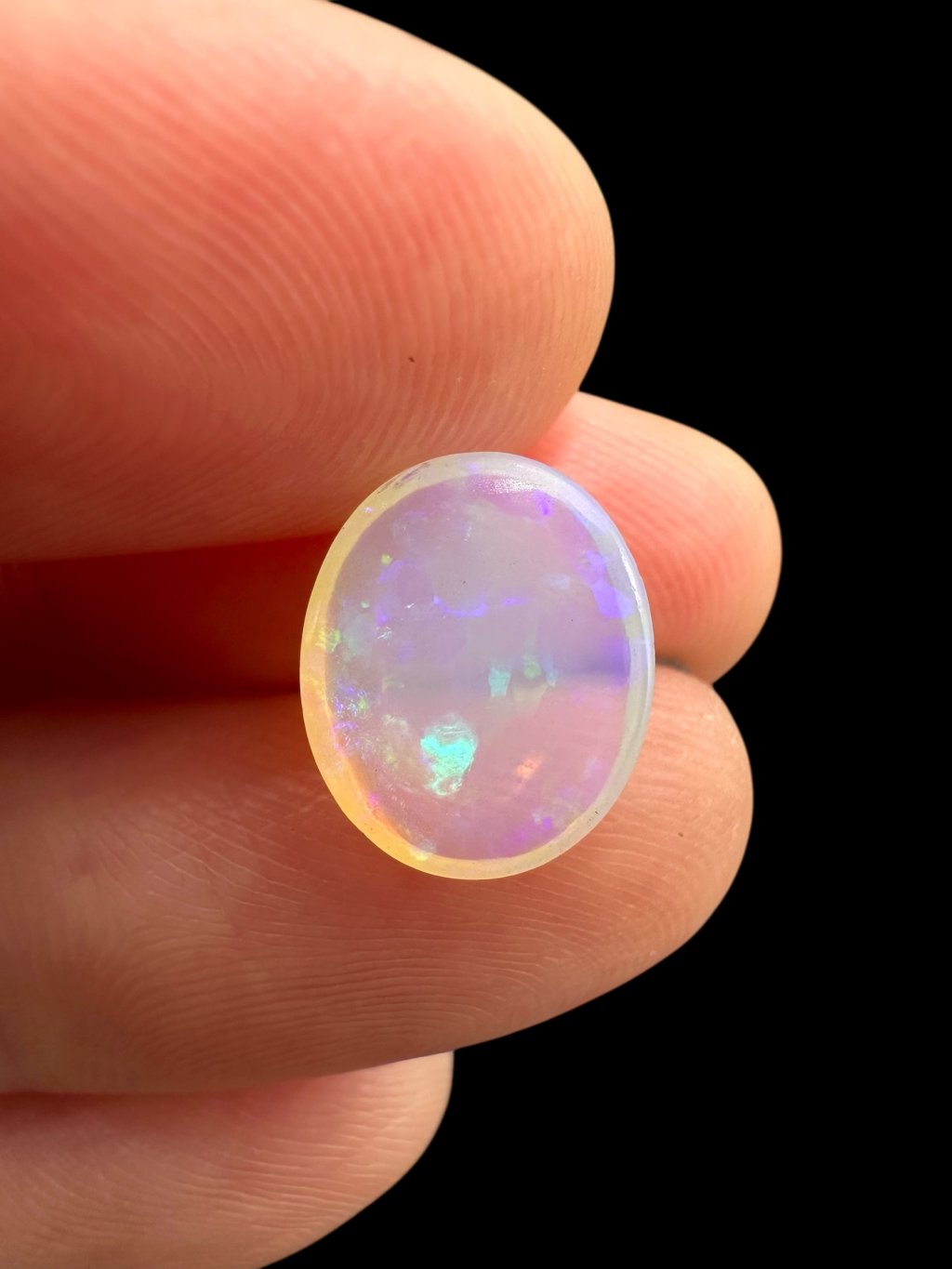 Äthiopische Kabochen können mit einer breiten Farbpalette aufwarten – von hellen, milchig-weißen Tönen über Gelb und Orange bis hin zu intensiven roten und grünen Reflexen. Viele Steine zeigen sogar seltene blaue oder violette Farbspiele. Dank des Kabochen-Schliffs fließen die Farben sanft über die gewölbte Oberfläche.