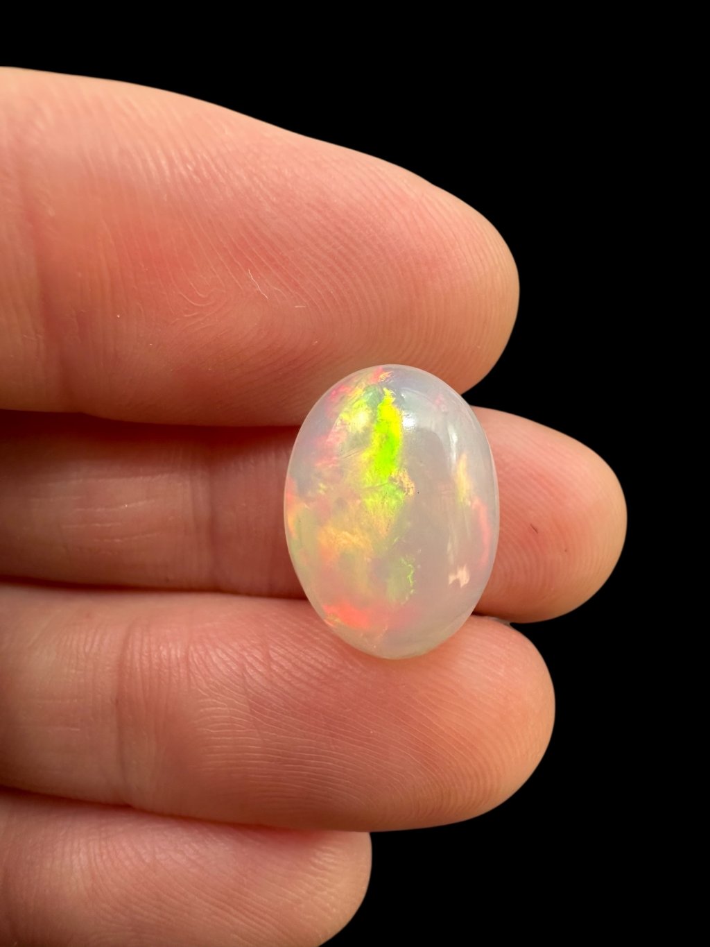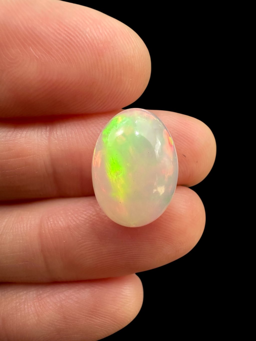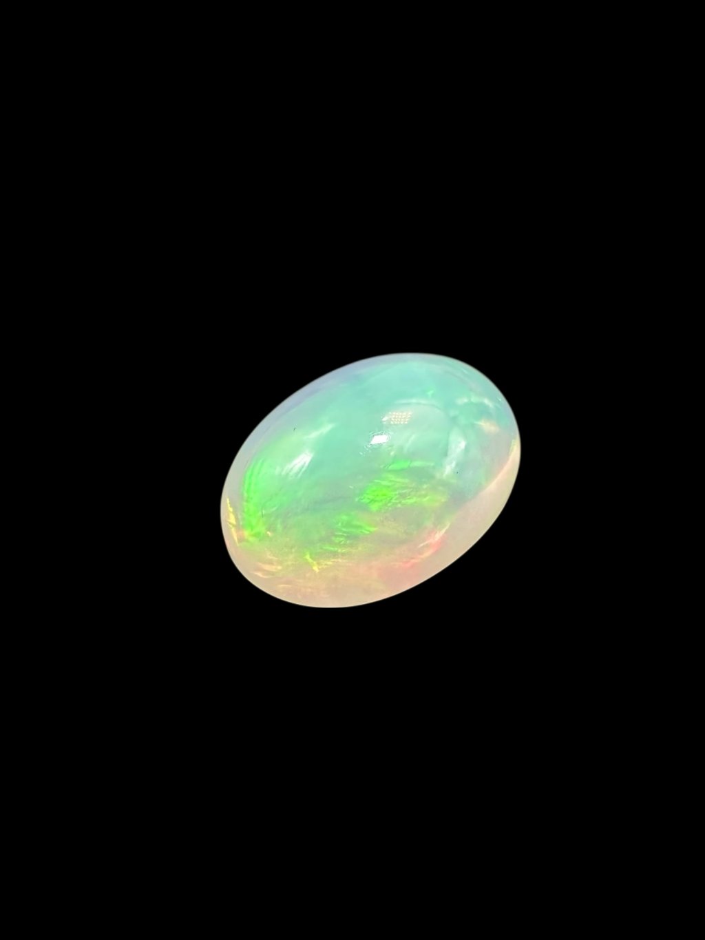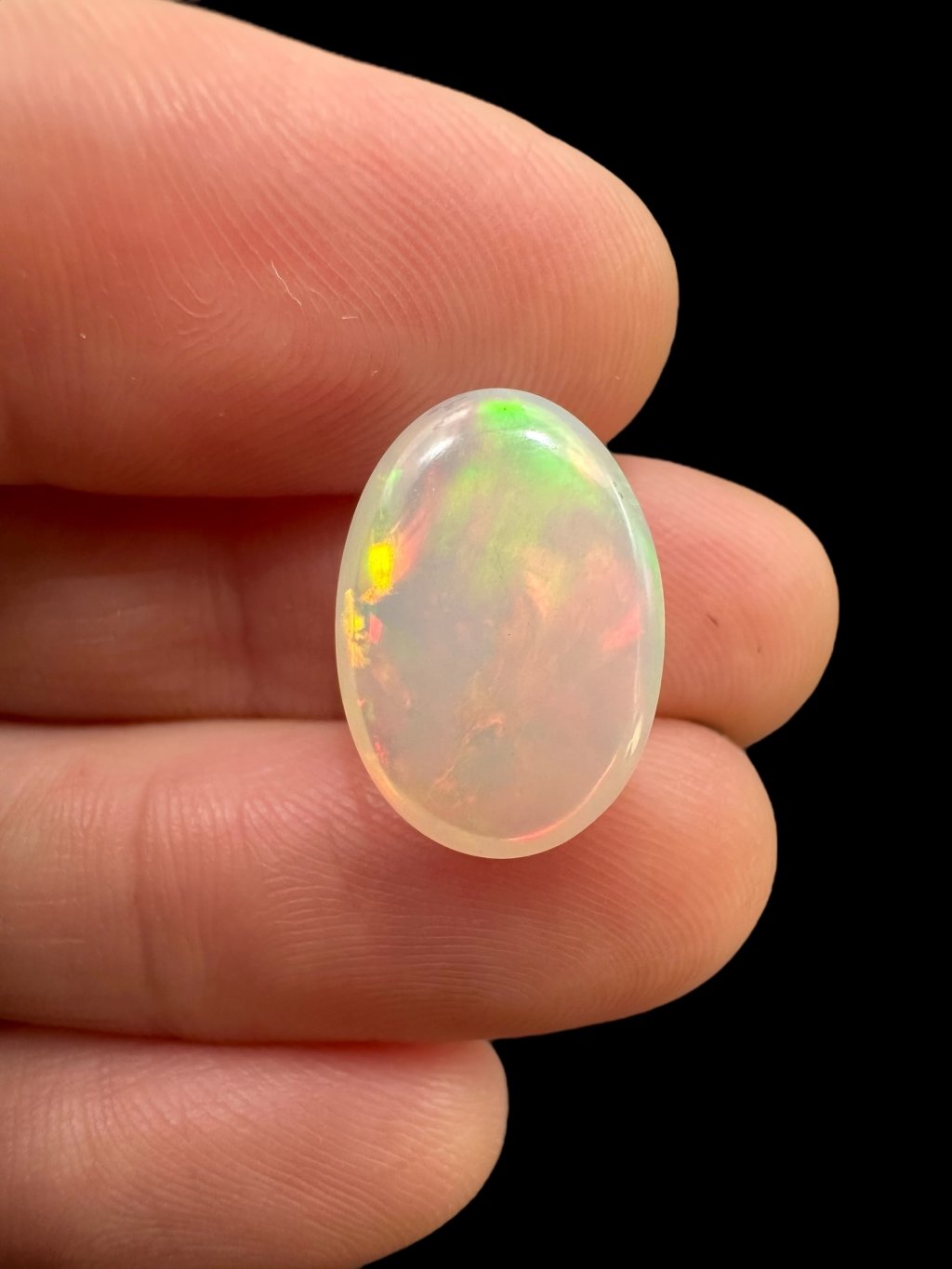 Äthiopische Kabochen können mit einer breiten Farbpalette aufwarten – von hellen, milchig-weißen Tönen über Gelb und Orange bis hin zu intensiven roten und grünen Reflexen. Viele Steine zeigen sogar seltene blaue oder violette Farbspiele. Dank des Kabochen-Schliffs fließen die Farben sanft über die gewölbte Oberfläche.