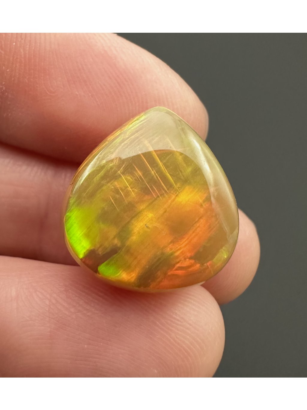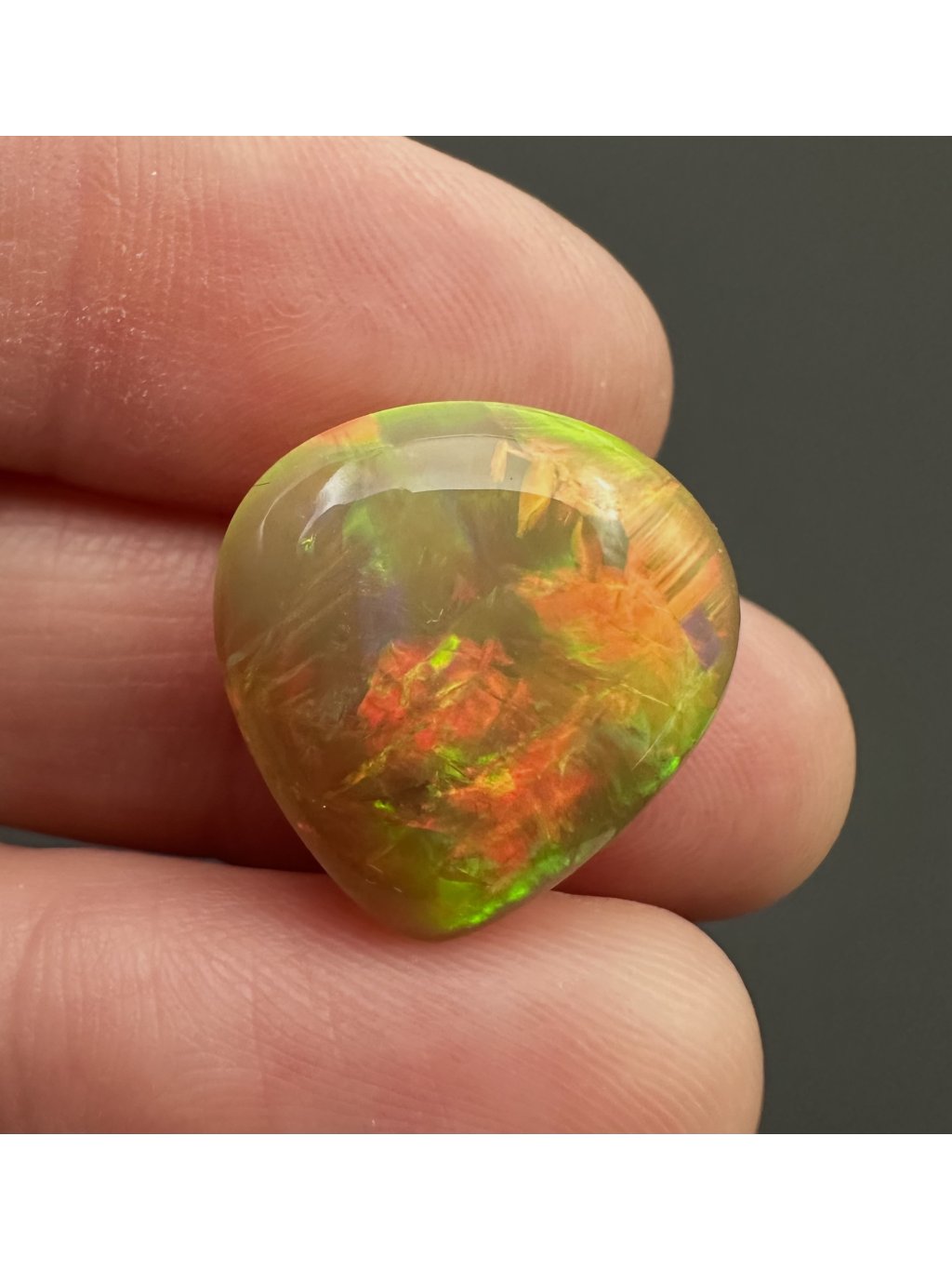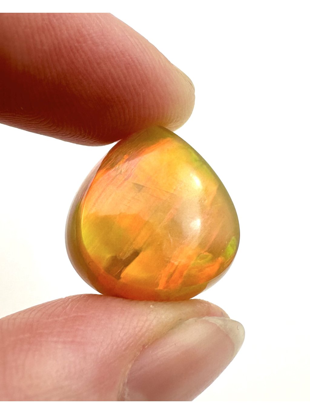 Äthiopische Kabochen können mit einer breiten Farbpalette aufwarten – von hellen, milchig-weißen Tönen über Gelb und Orange bis hin zu intensiven roten und grünen Reflexen. Viele Steine zeigen sogar seltene blaue oder violette Farbspiele. Dank des Kabochen-Schliffs fließen die Farben sanft über die gewölbte Oberfläche.