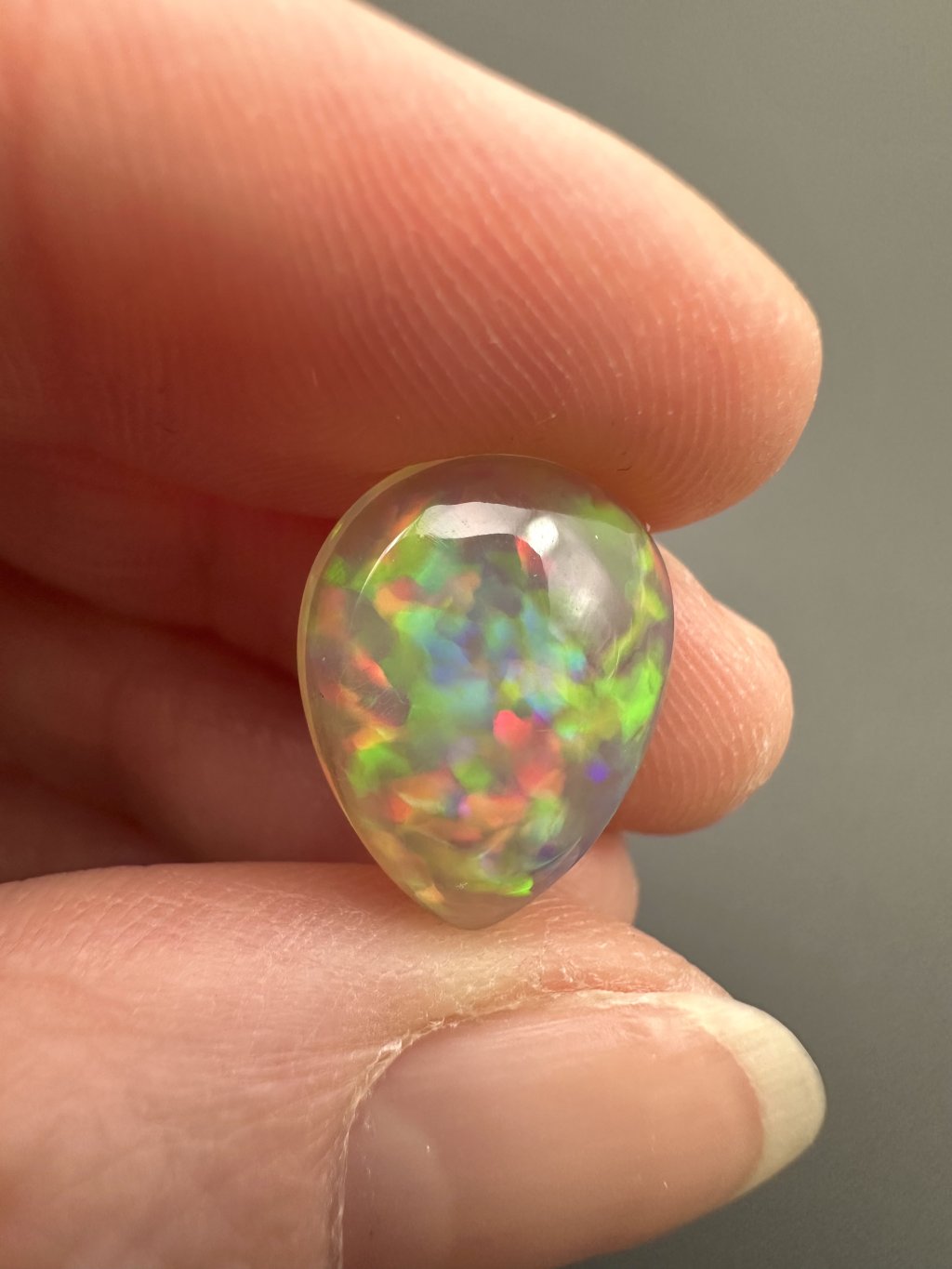 Äthiopische Kabochen können mit einer breiten Farbpalette aufwarten – von hellen, milchig-weißen Tönen über Gelb und Orange bis hin zu intensiven roten und grünen Reflexen. Viele Steine zeigen sogar seltene blaue oder violette Farbspiele. Dank des Kabochen-Schliffs fließen die Farben sanft über die gewölbte Oberfläche.