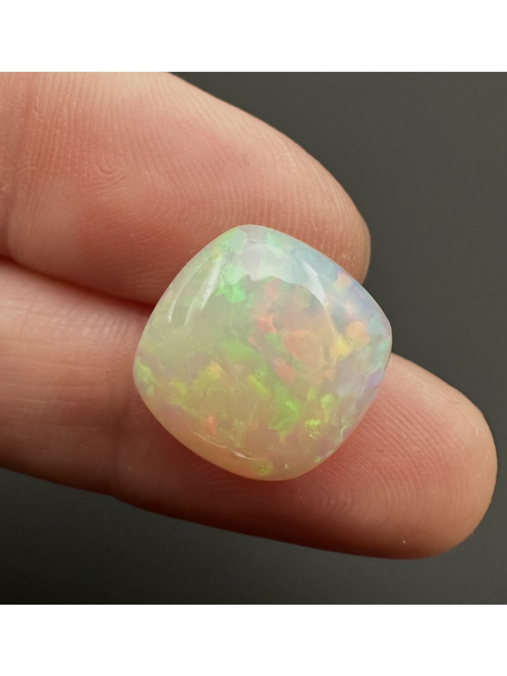 Äthiopische Kabochen können mit einer breiten Farbpalette aufwarten – von hellen, milchig-weißen Tönen über Gelb und Orange bis hin zu intensiven roten und grünen Reflexen. Viele Steine zeigen sogar seltene blaue oder violette Farbspiele. Dank des Kabochen-Schliffs fließen die Farben sanft über die gewölbte Oberfläche.