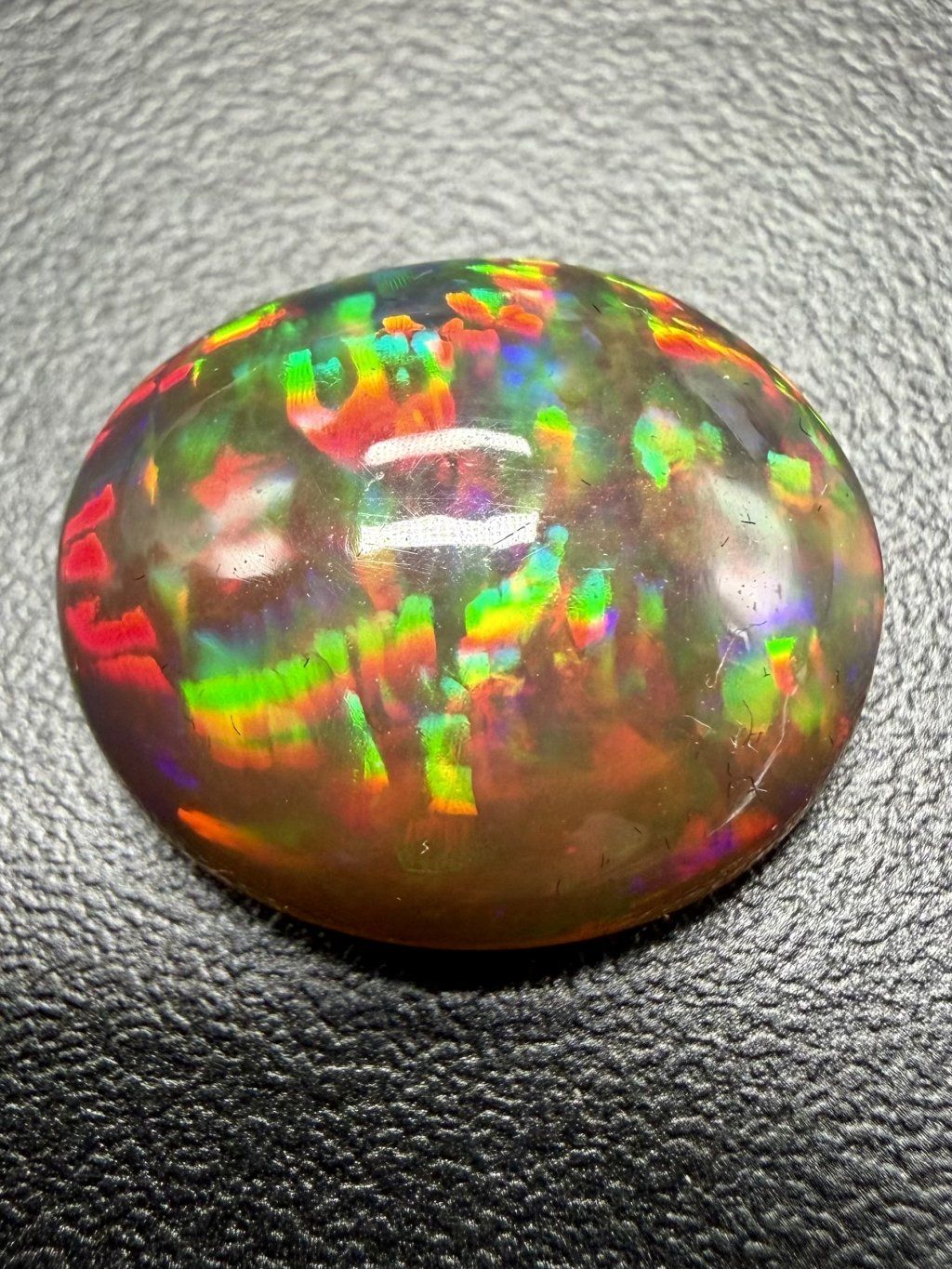 Äthiopische Opal-Kabochons zeichnen sich durch eine breite Farbpalette aus, die von hellen milchig-weißen Tönen über gelbe und orange Nuancen bis hin zu intensiven roten und grünen Farbreflexen reicht. Einige Stücke zeigen zudem ein seltenes blaues oder violettes Farbspiel, das sich dank des Kabochonschliffs harmonisch über die gewölbte Oberfläche erstreckt.