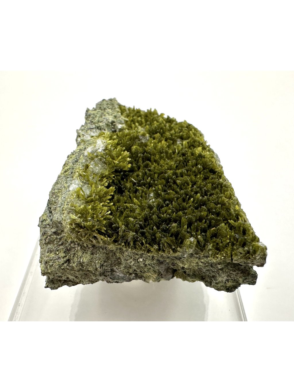 Epidot ist ein Mineral aus der Gruppe der Silikate, das für seine charakteristischen Grüntöne bekannt ist, die von hellem Pistaziengrün bis zu dunklem Grün reichen. Je nach Eisengehalt kann es auch eine gelbbraune oder rötlich-braune Farbe haben.