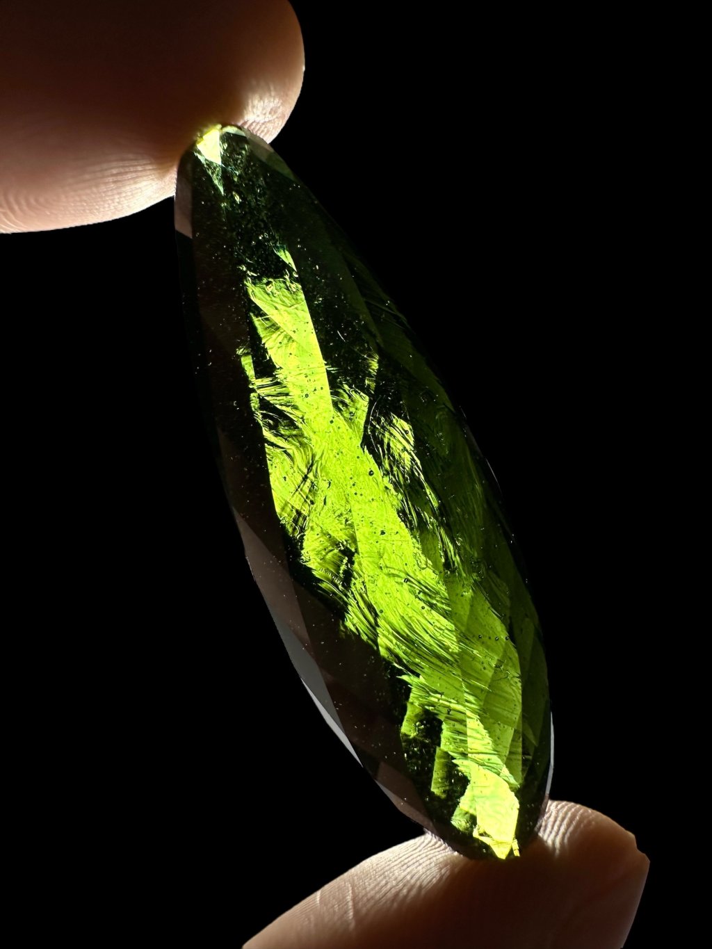 Die Idee für den einzigartigen Vortex Drop-Schliff kam unserem Schleifer in einem Traum – inspiriert von der Arbeit des renommierten Edelsteinmeisters Andrew Brown. Das ursprüngliche Design bestand aus 151 Facetten, wurde jedoch später überarbeitet, um eine noch dramatischere Wirkung zu erzielen. Im Traum sah er ein Moldavit, dessen Facetten sich zu einem dynamischen Energie-Wirbel im Inneren des Steins spiralförmig drehten.