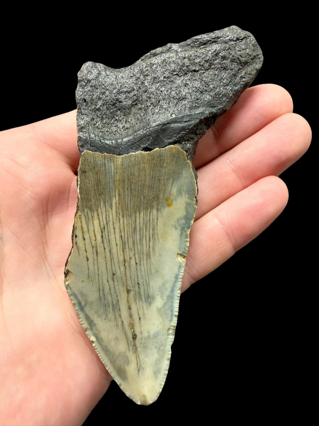 Die versteinerten Zähne des legendären Hais Carcharocles (Otodus) megalodon gehören zu den bekanntesten Fossilien prähistorischer Meere. Sie stammen aus dem Miozän, genauer aus dessen oberer Stufe, dem Serravallium, und sind auf etwa 13 Millionen Jahre datiert. Die Zähne konnten nahezu 17 Zentimeter erreichen, waren kräftig, dreieckig und mit feinen Sägekanten versehen, die zum Schneiden von Fleisch und Knochen großer Meeressäuger dienten. Gefunden wurde das Stück in North Carolina, USA, einer Region, die für fossilreiche Sedimente mit Megalodon-Zähnen und Überresten anderer Haie bekannt ist.