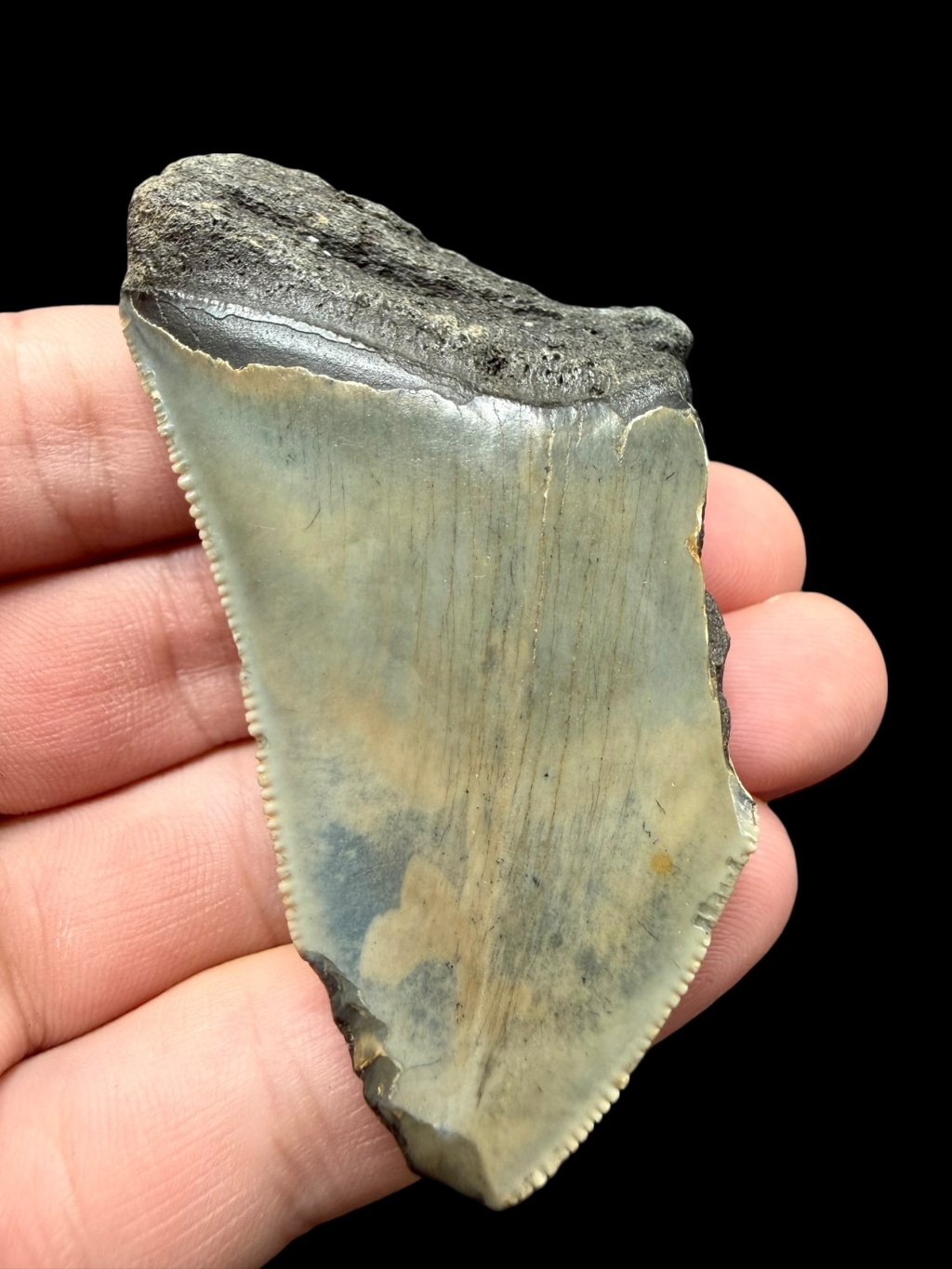 Die versteinerten Zähne des legendären Hais Carcharocles (Otodus) megalodon gehören zu den bekanntesten Fossilien prähistorischer Meere. Sie stammen aus dem Miozän, genauer aus dessen oberer Stufe, dem Serravallium, und sind auf etwa 13 Millionen Jahre datiert. Die Zähne konnten nahezu 17 Zentimeter erreichen, waren kräftig, dreieckig und mit feinen Sägekanten versehen, die zum Schneiden von Fleisch und Knochen großer Meeressäuger dienten. Gefunden wurde das Stück in North Carolina, USA, einer Region, die für fossilreiche Sedimente mit Megalodon-Zähnen und Überresten anderer Haie bekannt ist.