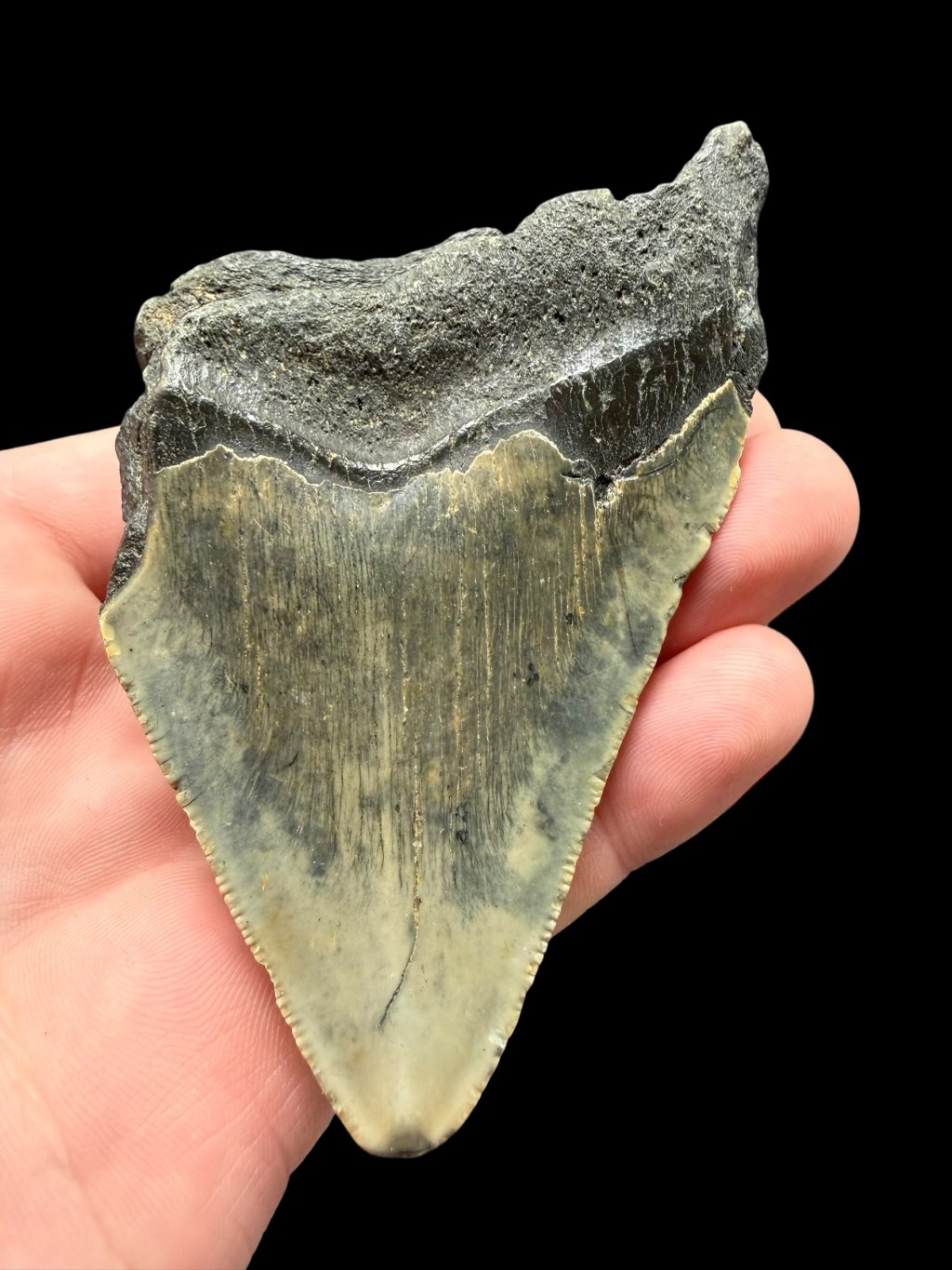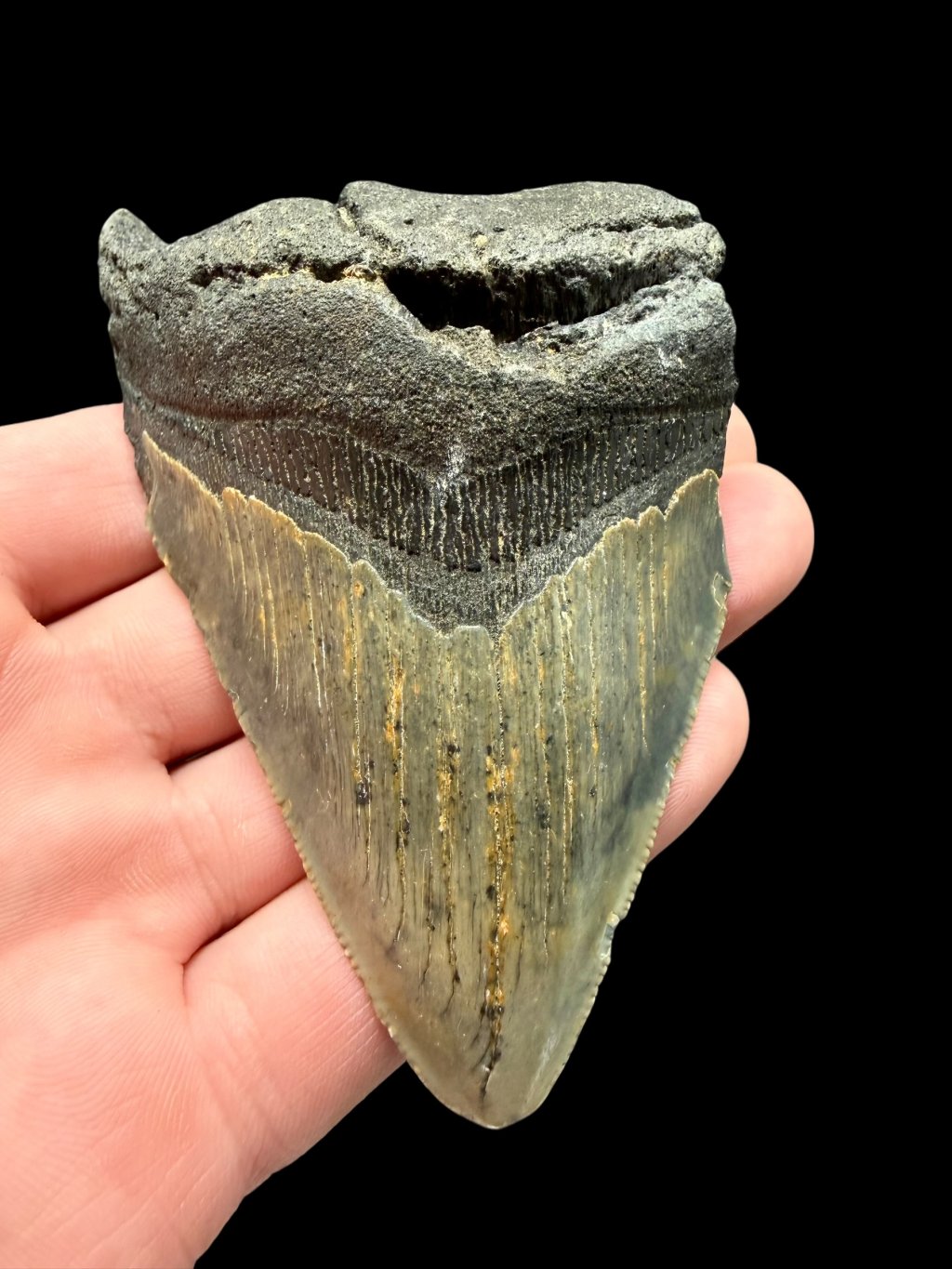 Die versteinerten Zähne des legendären Hais Carcharocles (Otodus) megalodon gehören zu den bekanntesten Fossilien prähistorischer Meere. Sie stammen aus dem Miozän, genauer aus dessen oberer Stufe, dem Serravallium, und sind auf etwa 13 Millionen Jahre datiert. Die Zähne konnten nahezu 17 Zentimeter erreichen, waren kräftig, dreieckig und mit feinen Sägekanten versehen, die zum Schneiden von Fleisch und Knochen großer Meeressäuger dienten. Gefunden wurde das Stück in North Carolina, USA, einer Region, die für fossilreiche Sedimente mit Megalodon-Zähnen und Überresten anderer Haie bekannt ist.