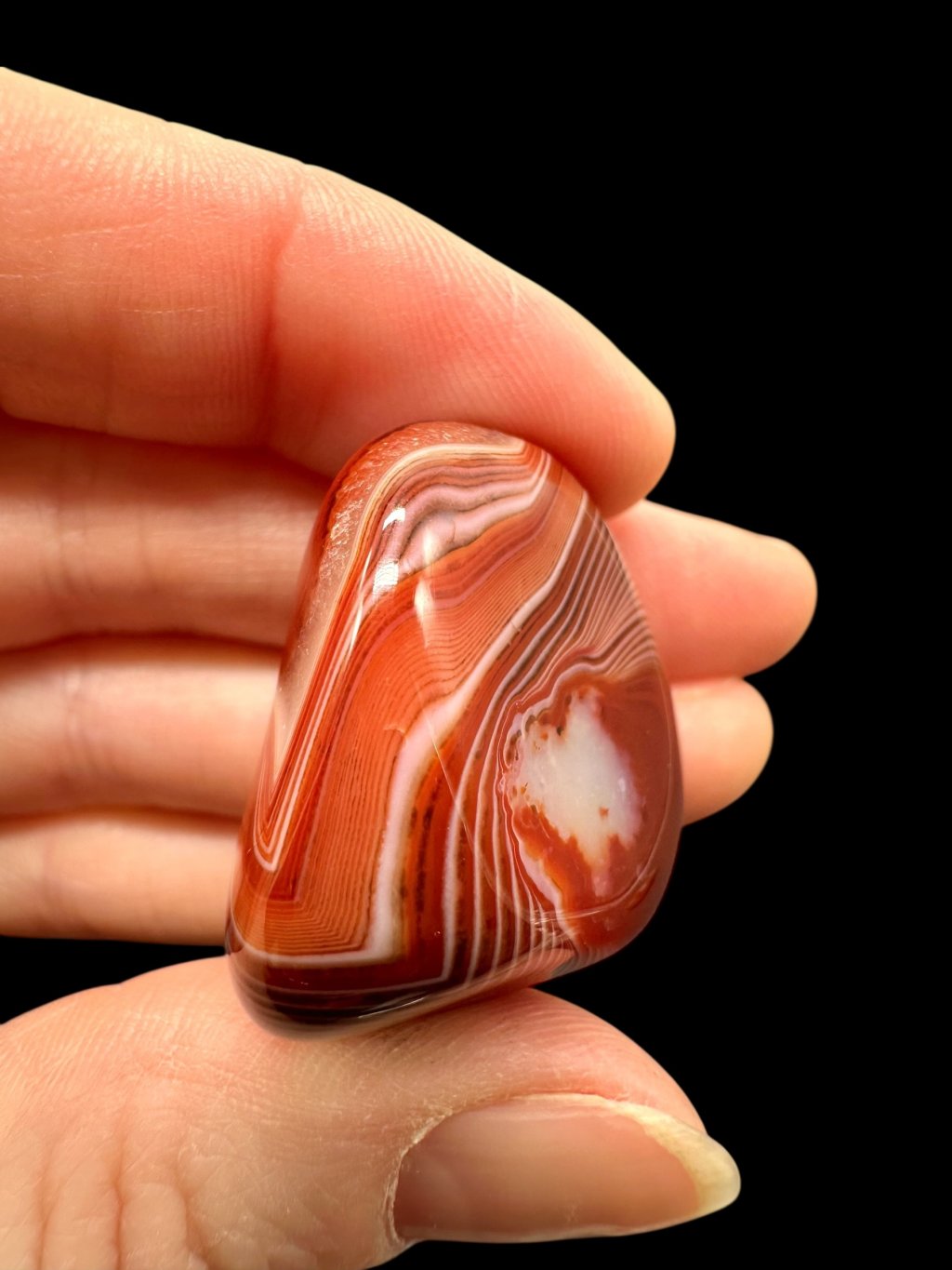 Einige Achate können erhitzt werden, um ihre natürliche Farbe zu verstärken. Beim Erhitzen wandeln sich weniger stabile Eisenformen in Hämatit um, was zu intensiveren roten und orangefarbenen Tönen führt. Dieser Prozess ist in der Gemmologie üblich und verändert die grundlegende mineralische Zusammensetzung des Steins nicht. Die resultierende Farbe ist dauerhaft und stabil.